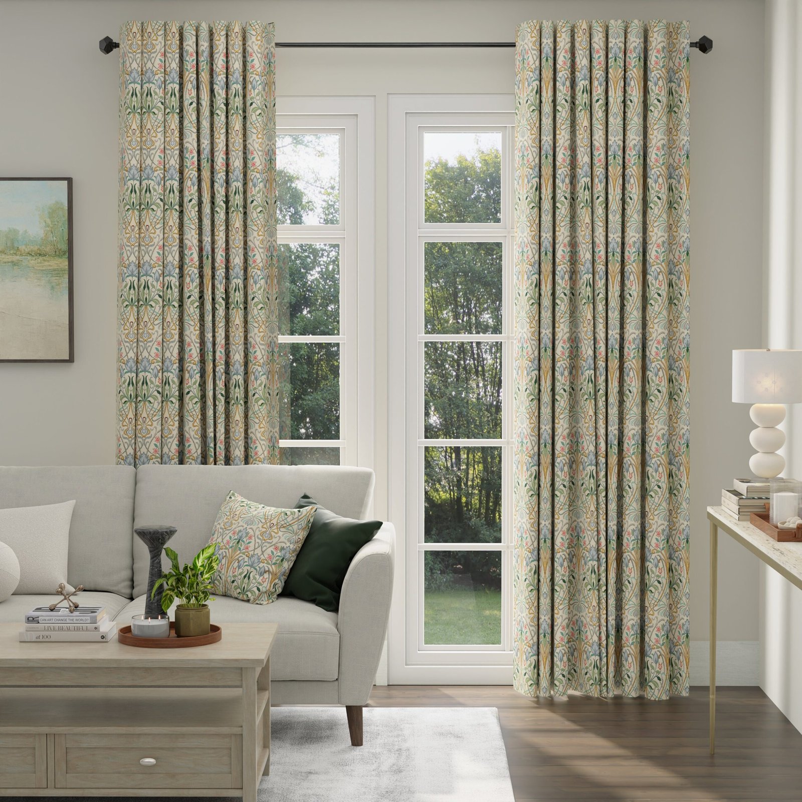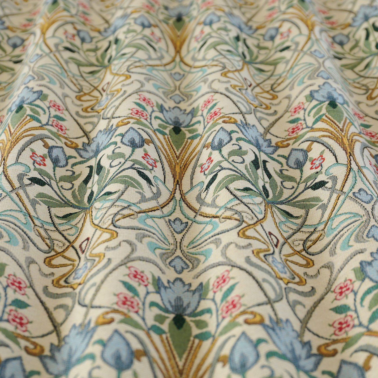These made-to-measure curtains from the ANTE DECOR collection feature the Alexandra Woven Jacquard fabric in blue. The traditional floral design, highlighted by green leaves and vines, enhances any arts and crafts project or interior setting. Elevate your living space with this elegant fabric that adds a refined, enduring charm to your home environment.