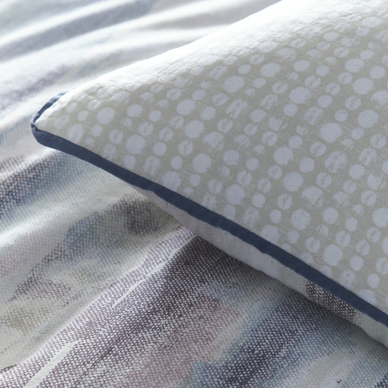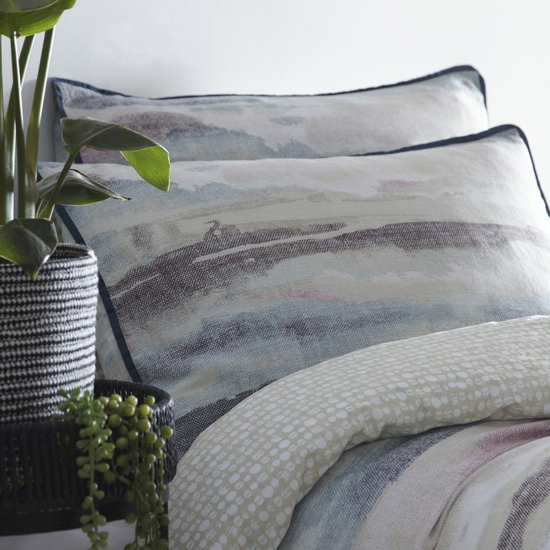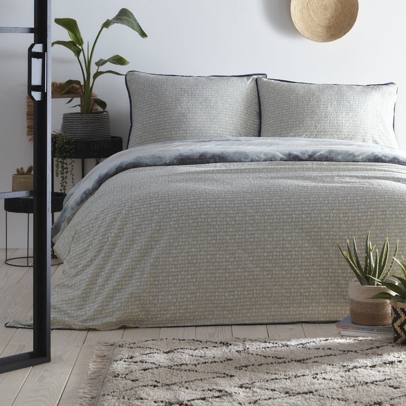 Here is the Landscape 100% cotton bedding set. This rich abstract design features waves of painterly texture and fresh watercolour style tones. This duvet set can also be reversed for a brand new geometric style look in a soft neutral tone. Shots of blue piping edge the design. This stylish design is from the Appletree Relaxed bedding collection.