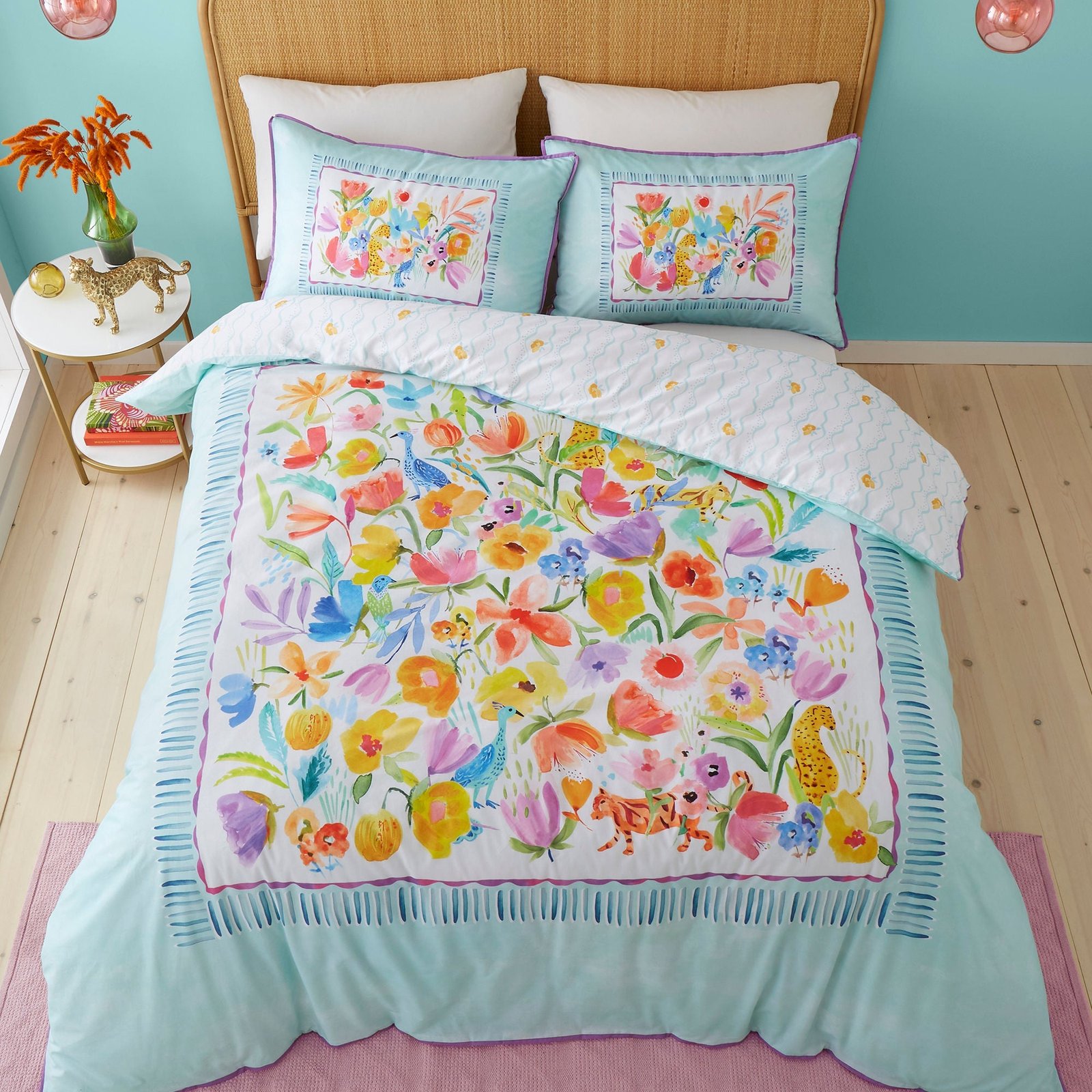 Transform your bedroom into an elegant oasis with the Festival Bedding Set Duck Egg by Appletree Style. This sophisticated set features a captivating watercolour floral and animal print paired with a refined duck egg border. The reverse side showcases a charming blend of floral and striped patterns, offering both style and versatility. Crafted from 100% Cotton, this set provides indulgent comfort and superior quality. Embrace the fusion of fashion and function with Appletree Style for a chic and contemporary sleeping space.