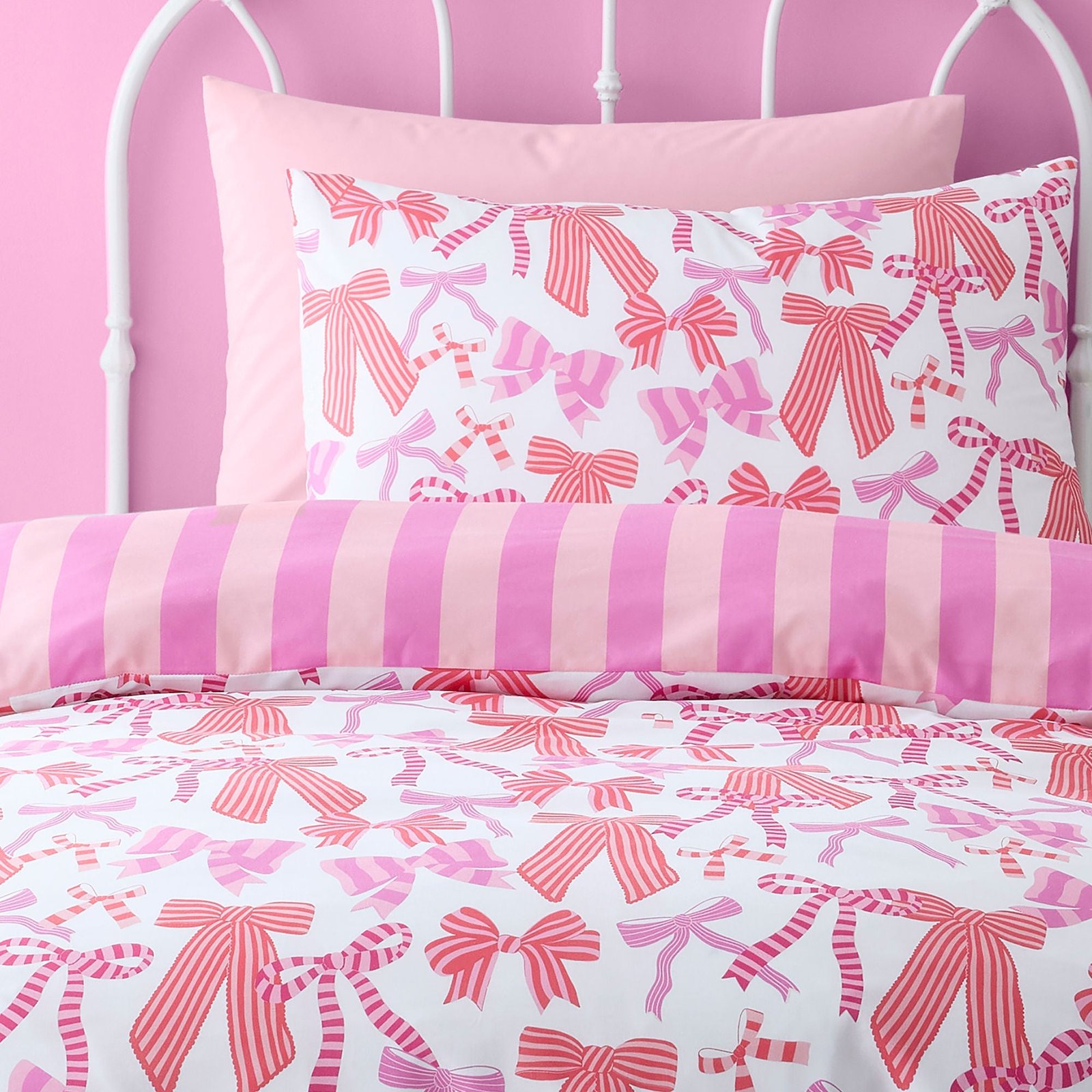 Discover the vibrant charm of the Bedlam Bows & Stripes Duvet Cover Set. Featuring striking pink bows against a crisp white background and broad stripes on the reverse, this reversible bedding offers versatile style. Crafted from low-maintenance polyester, it combines playful design with practical care for a distinctive bedroom update.