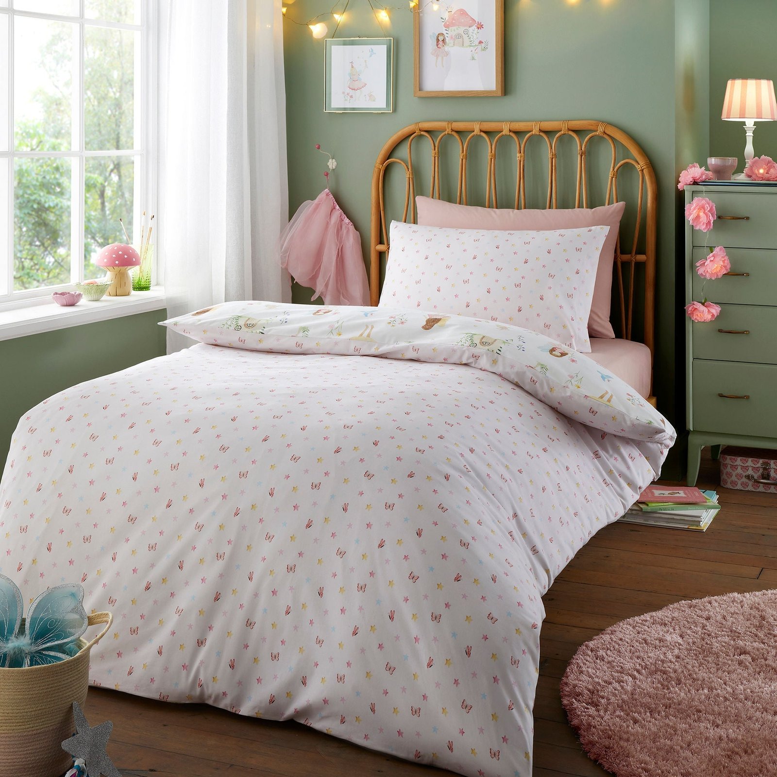 Transform bedtime into a whimsical adventure with this Bedlam Summer Fairies children’s duvet cover set. One side features delightful fairy characters, shimmering stardust accents, and charming floral details set against a dreamy landscape complete with enchanting toadstool cottages. Reverse the cover to reveal a serene starlit design adorned with watercolour constellations and graceful pink butterflies. Crafted from durable polycotton blend fabric, this set resists staining and simplifies laundering—ideal for active children. The soft, breathable material ensures comfortable sleep while maintaining its vibrant colours wash after wash. Perfect for young imaginations seeking comfort and magic.
