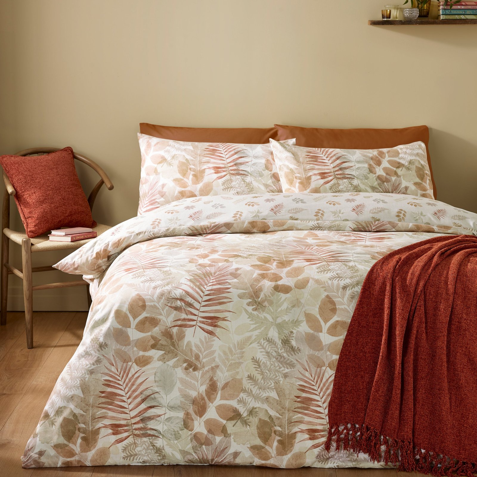 Create a warm and inviting autumnal bedroom with this elegant bedding set. It features a beautiful pattern of leaves in natural shades that evoke the spirit of fall. The duvet cover is fully reversible, offering two distinct designs with a delicate leaf spray throughout. Digitally printed for sharp detail and vibrant colour, this microfibre set is both easy to care for and quick drying, making it a practical choice for effortless seasonal style and comfort.