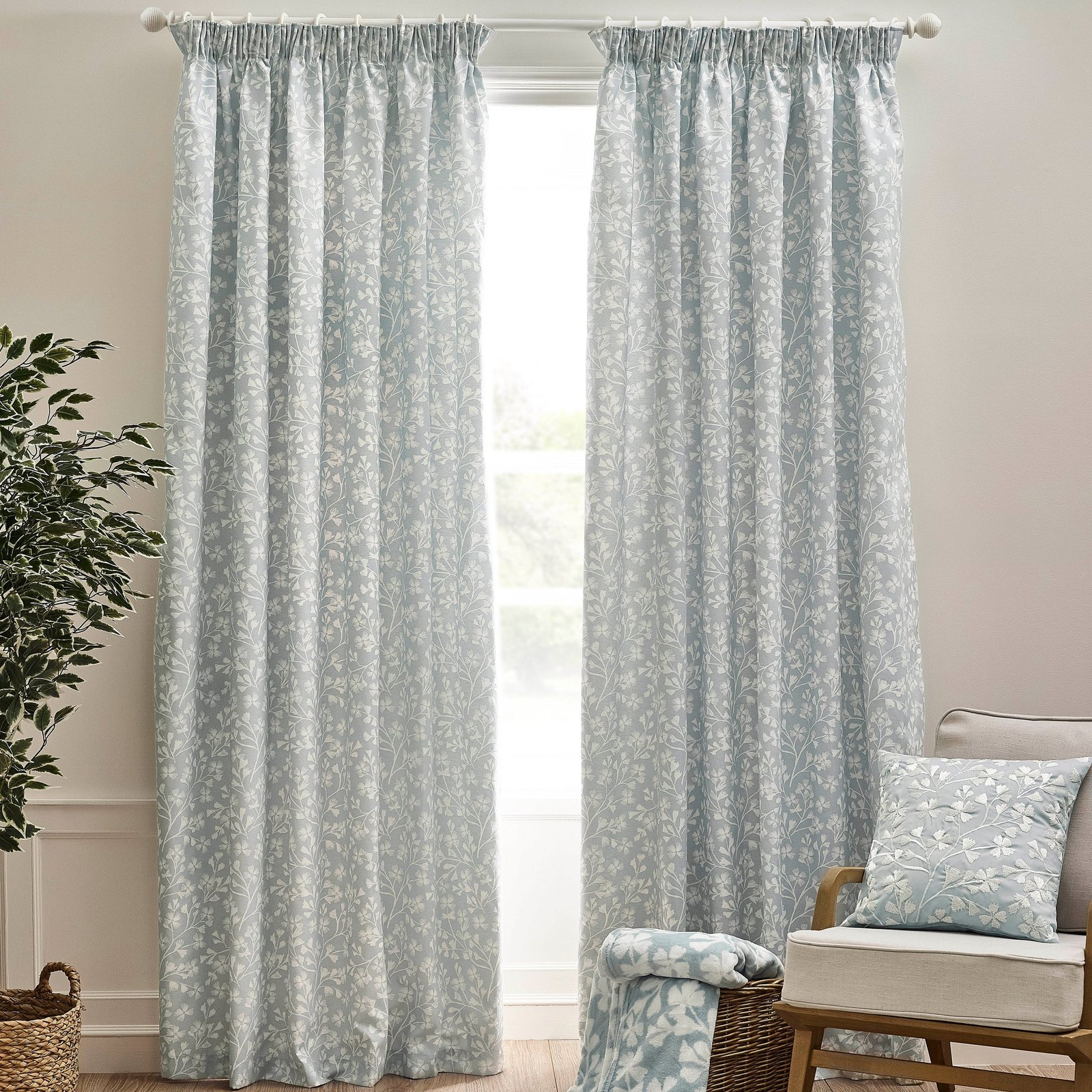 Catherine Lansfield Brooke Floral Ready Made Pencil Pleat Curtains Duckegg