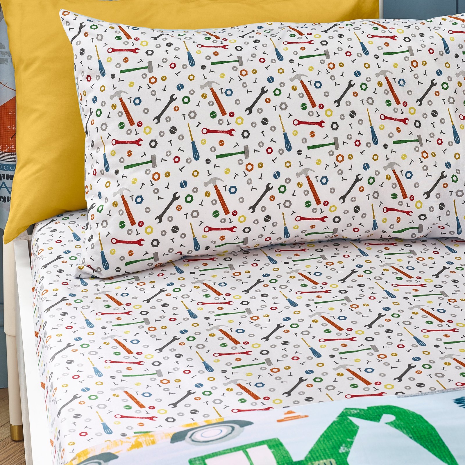 Introduce little builders to a world of construction excitement with this expertly crafted fitted sheet from Catherine Lansfield. Featuring vibrant dump trucks, excavators, and cranes, it transforms ordinary sleep into imaginative play. The thoughtfully blended composition of soft cotton and durable recycled polyester ensures comfort while remaining practical for frequent washing. Designed and developed in Great Britain, this sheet meets rigorous quality standards and carries MADE IN GREEN by OEKO-TEX® certification, reflecting both safety excellence and environmental responsibility. Perfect for young enthusiasts who dream of diggers.