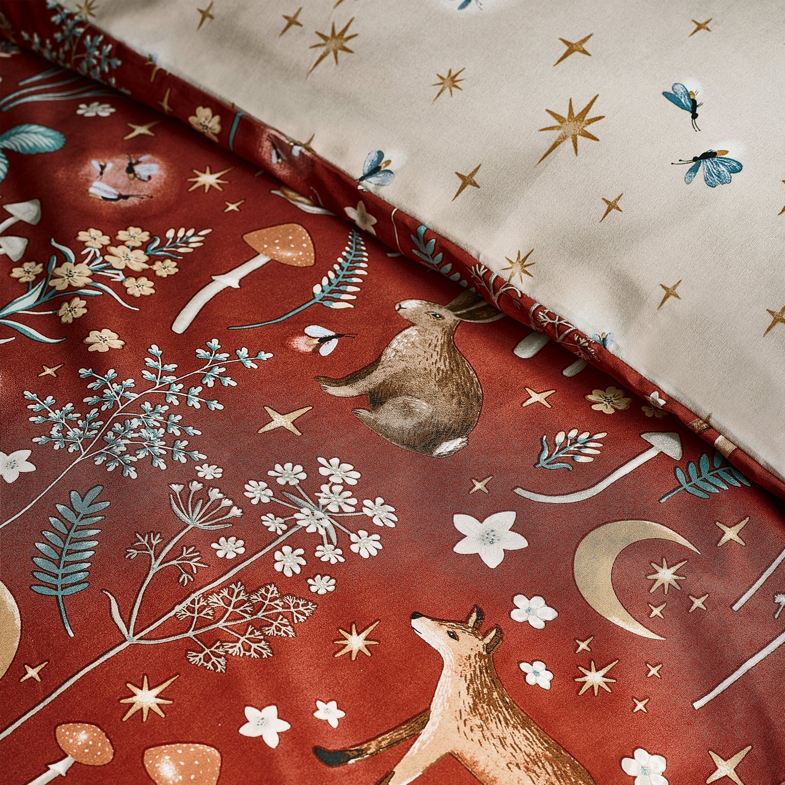 Transform your bedroom into a magical retreat with this folklore-inspired bedding set. Adorned with detailed illustrations of foxes, owls, and rabbits, it brings a touch of whimsy and charm to your décor. The fully reversible design showcases a delicate star and feather pattern in a softer shade, offering versatile styling options. Crafted from a blend of easy-care recycled polyester and soft cotton, this set ensures durability and comfort for everyday use.Â