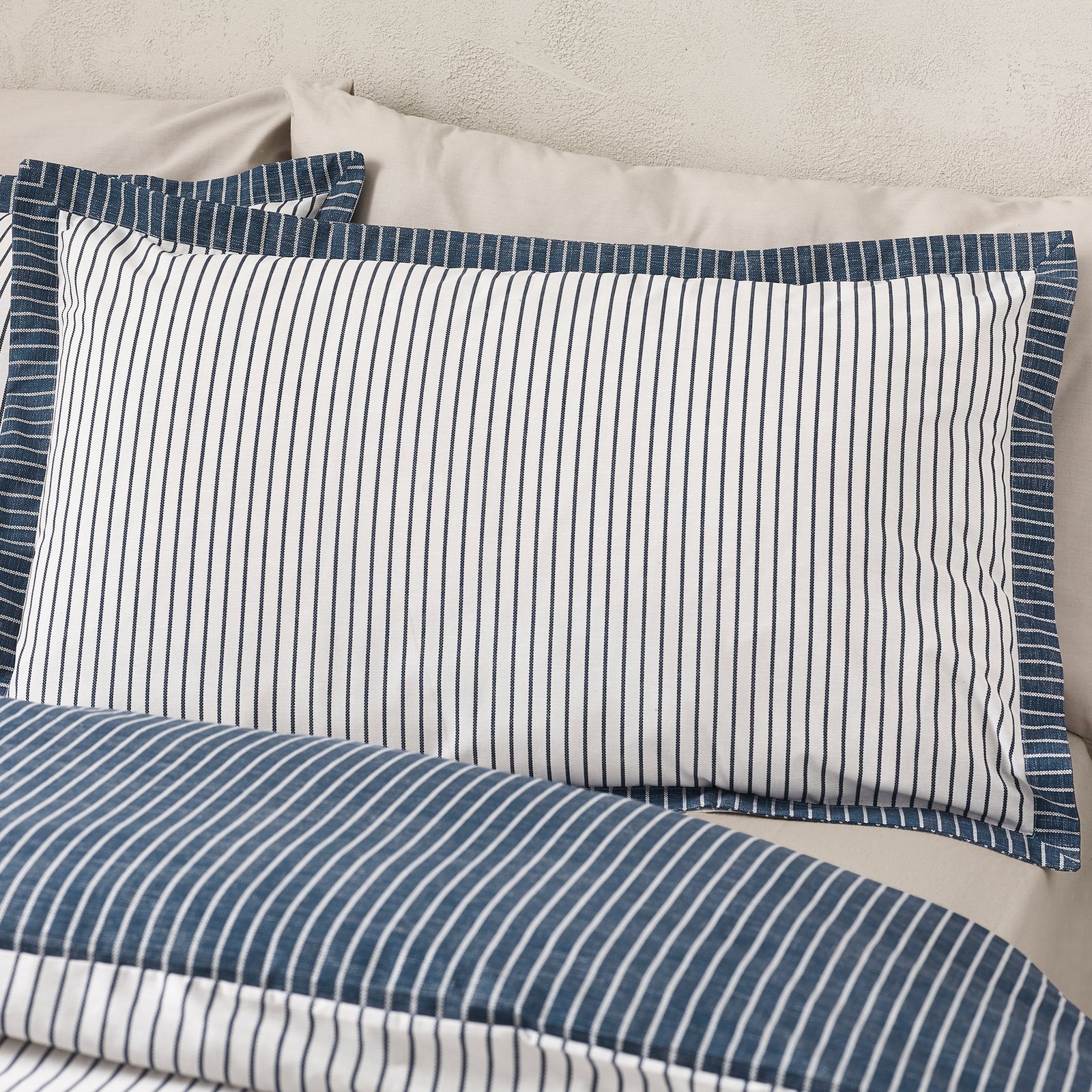 This timeless bedding set showcases an elegant pinstripe design, complemented by a contrasting darker reverse for flexible styling options. The oxford border pillowcases contribute a polished finish, ideal for those seeking a crisp and tailored aesthetic. Crafted from a practical blend of recycled polyester and soft cotton, it offers comfort and convenience for daily use.