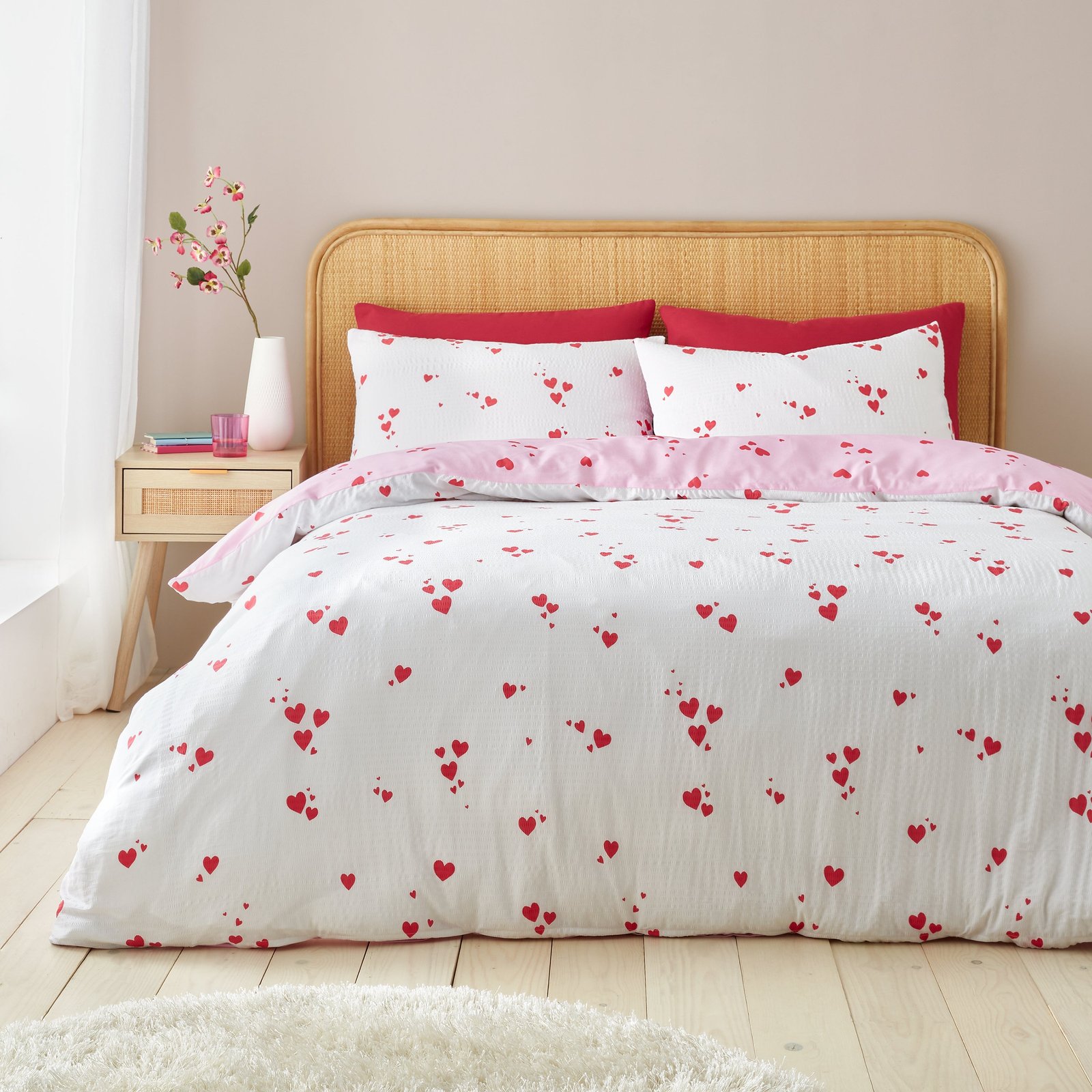 Catherine Lansfield Seersucker Heart Easy Care Duvet Cover Bedding Set White Red