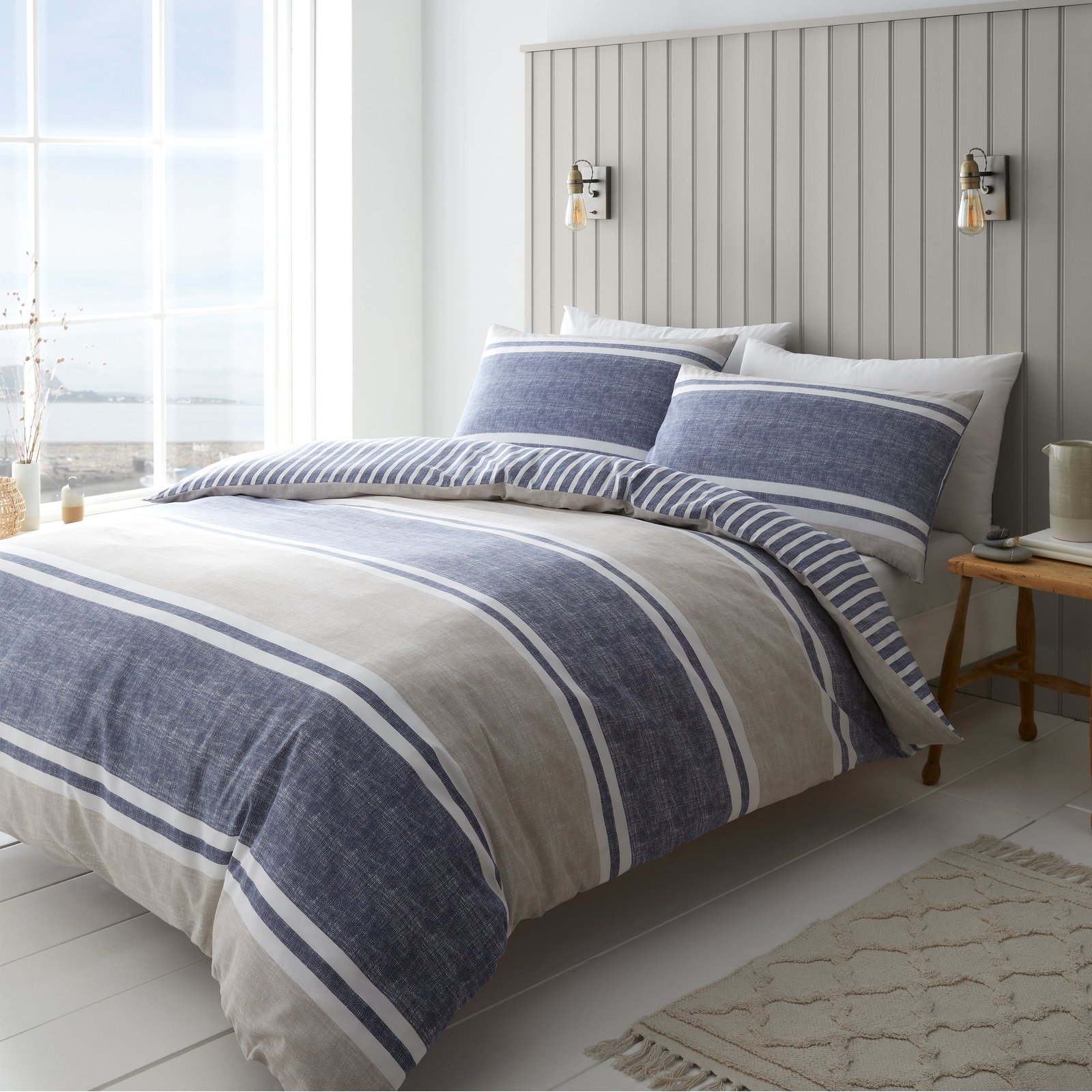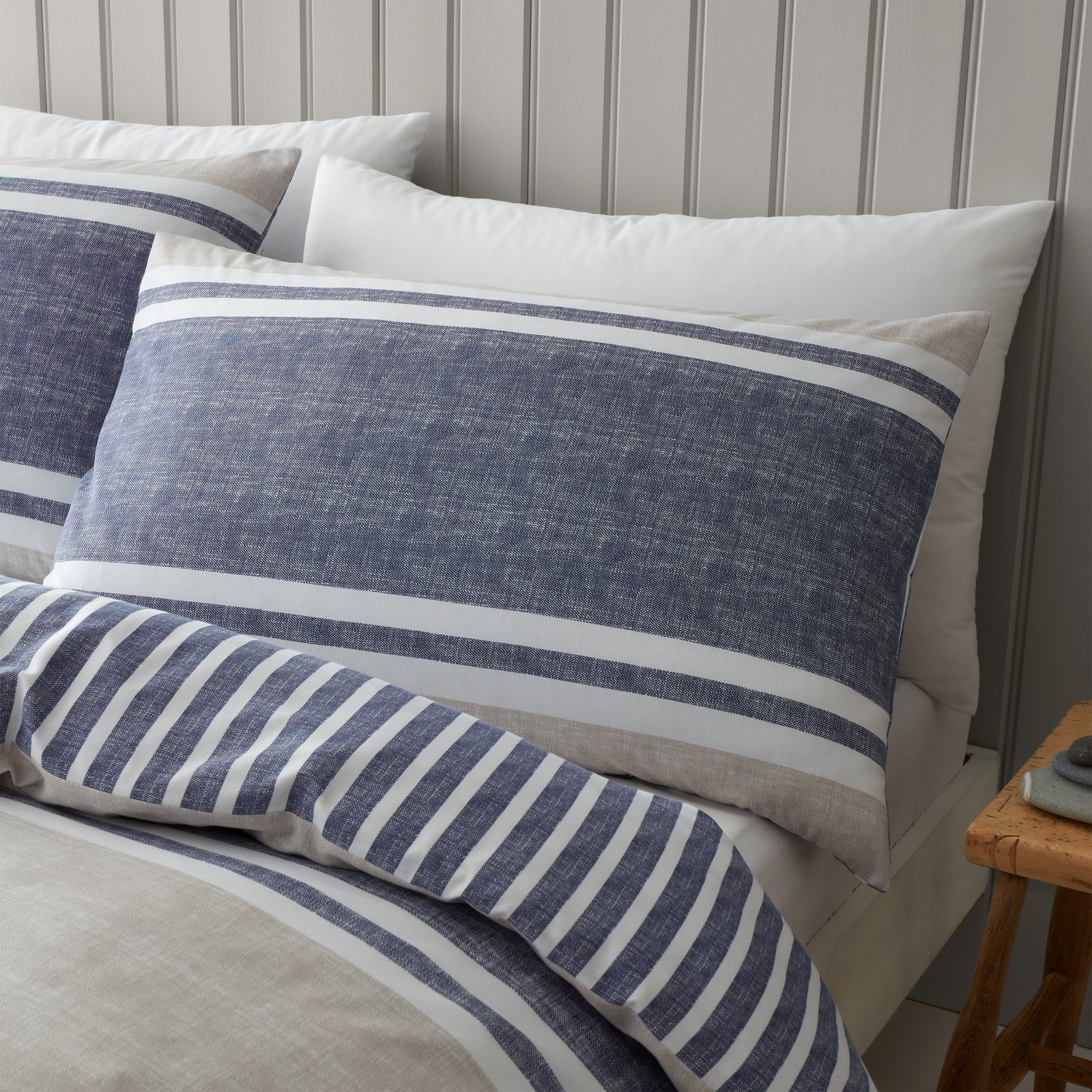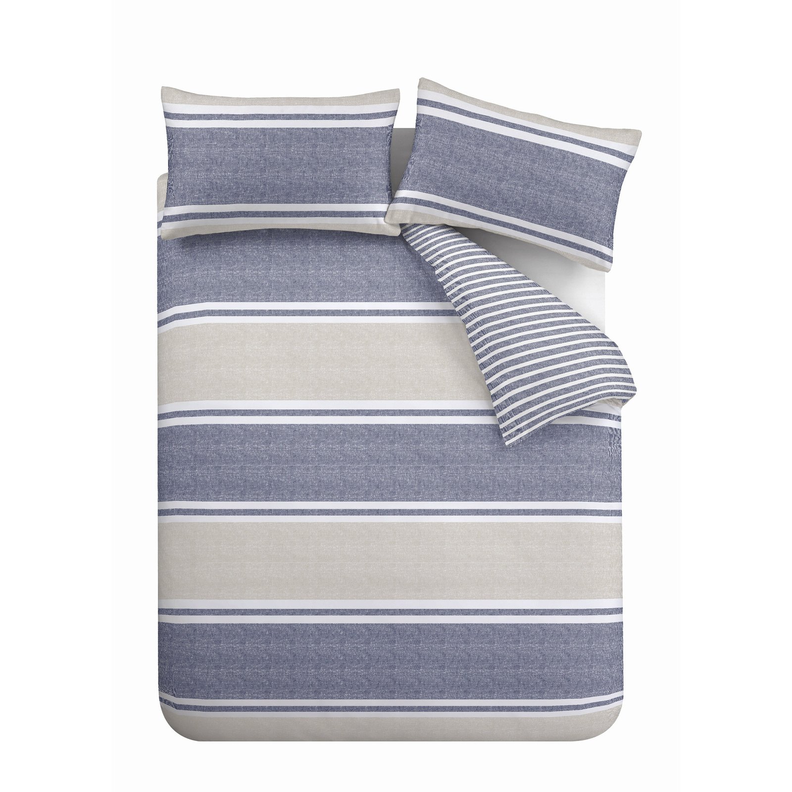 Add classic style to your room with the Textured Banded Stripe bedding set, combining subtle textured bands in a blend calming tones bring a style refresh to any room in the home. Fully reversible, this bedlinen offers two relaxed stripe looks in one. This blend of 52% polyester and 48% cotton is created from easy-care and durable polycotton fabric and is perfect for everyday use.