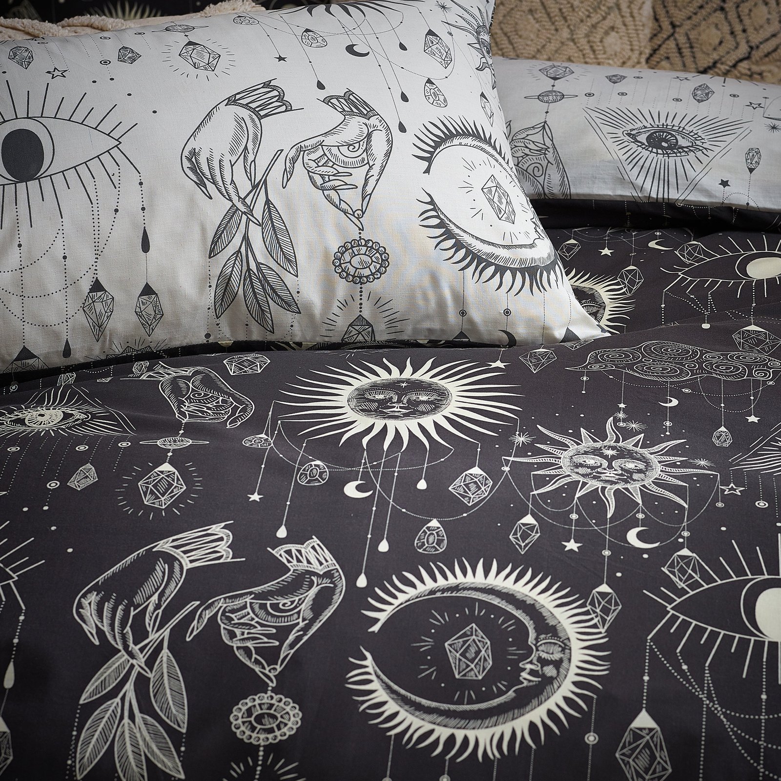 Create a serene retreat in your bedroom with the Constellation Duvet Cover Set. Featuring celestial designs of the moon, sun, and crystals, it evokes a calm, starry ambience ideal for restful sleep. The reversible style offers two elegant looks in one, easily switched to refresh your space. Constructed from a cotton blend, it delivers a perfect balance of softness and resilience. Expertly designed, this set provides both comfort and sophistication to help you craft a bedroom that reflects your personal style.