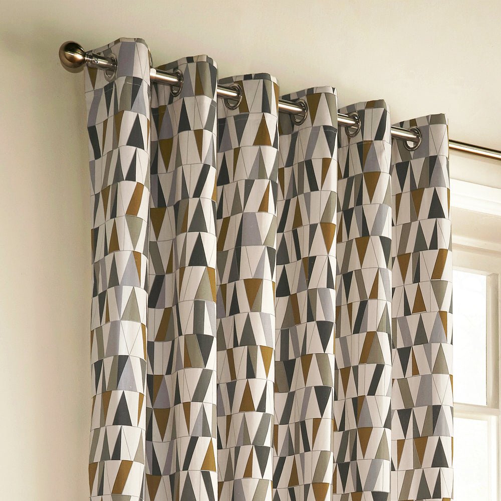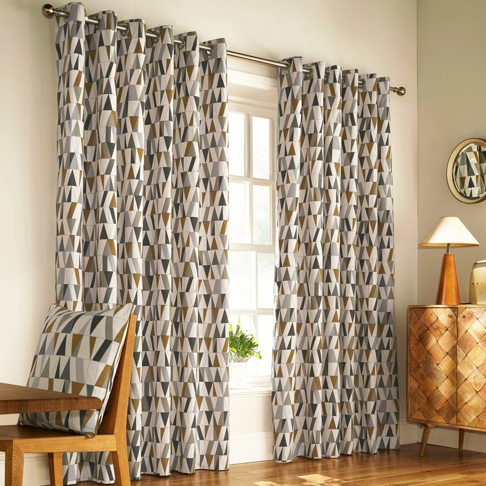 Enhance the ambiance of your home with this stylish and modern curtain set, featuring a mix of geometric patterns. The warm-toned, fully-lined design complements a variety of decor styles, particularly Swiss and Scandi interior designs, with its eye-catching gold accents and easy-to-use eyelet headings.