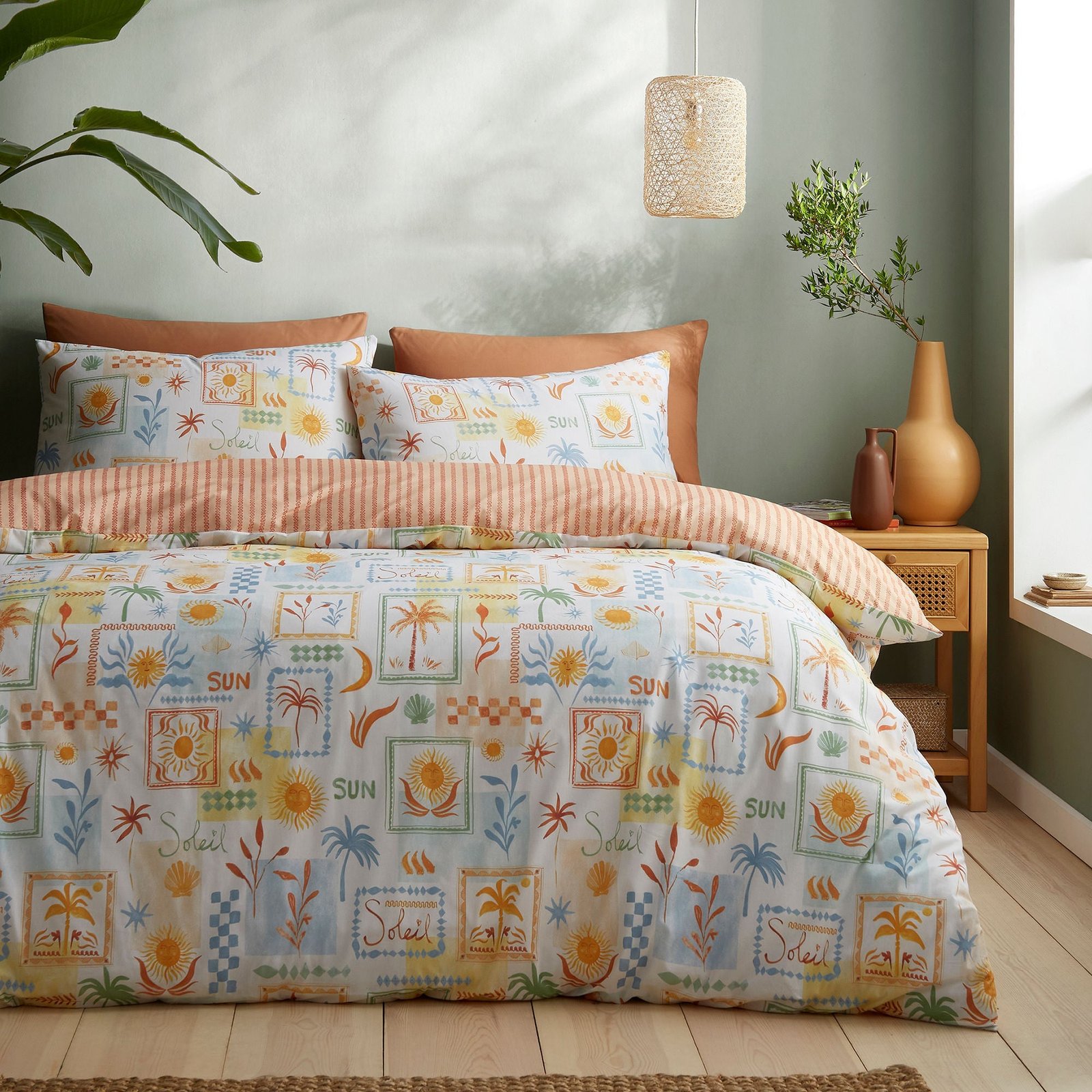 Bring warmth and character to your bedroom with the Fusion Soleil Duvet Cover Bedding Set. This vibrant collection showcases artfully rendered suns, tropical palms, seashells, and geometric motifs in rich golden yellow, burnt orange, and coastal blue tones. The reverse features elegant wavy terracotta stripes, offering versatility in styling. Crafted from practical polycotton, the set delivers both durability and effortless maintenance, making it an ideal choice for those seeking colour and personality without compromising on everyday practicality.