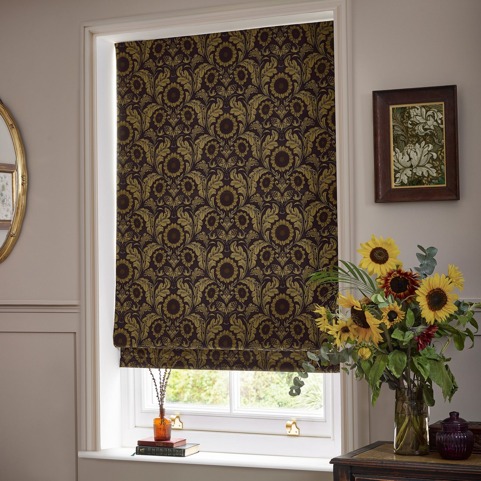 The HOUSE Llewelyn-Bowen Sunny Side Up Curtains in Midnight are expertly crafted made-to-measure window treatments tailored to fit your space perfectly. Featuring a striking sunflower print, these curtains combine rich black and golden hues to create a sophisticated, moody aesthetic that adds depth and warmth to any room. Made from 100% cotton, the fabric offers durability along with a soft texture that enhances comfort while blocking light effectively. Designed to elevate interiors, these curtains blend contemporary style with classic appeal, making them an ideal choice for those seeking both elegance and functionality in window dressings.