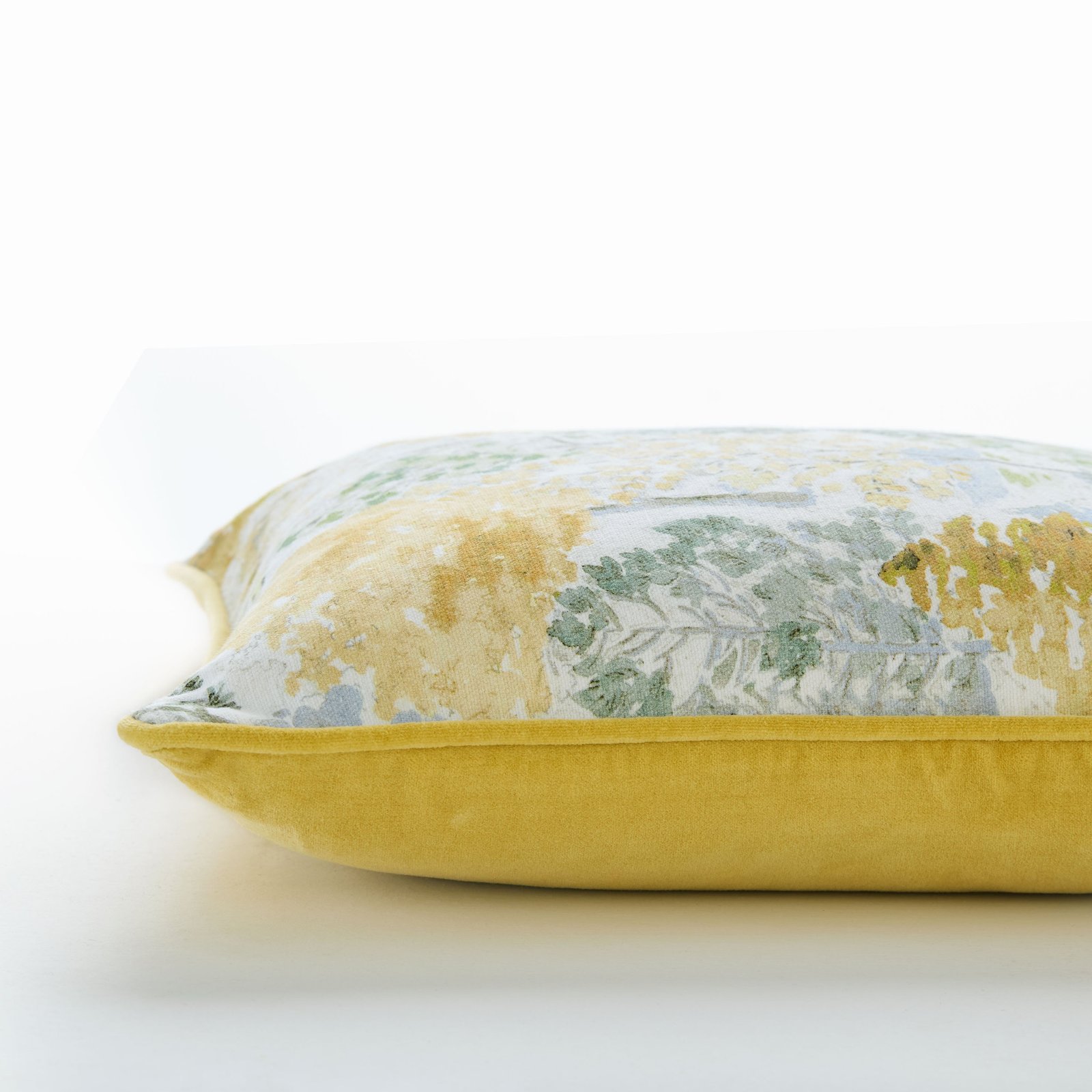 This Bernwood cushion evokes the peaceful atmosphere of a quiet woodland, printed on a cotton linen fabric and paired with a sumptuous ochre cotton velvet reverse. Featuring piped edge detailing, this 45×45 cm cushion adds a serene and timeless accent to any room. It is filled with a luxurious fine denier recycled fibre pad that offers a feather-like softness.