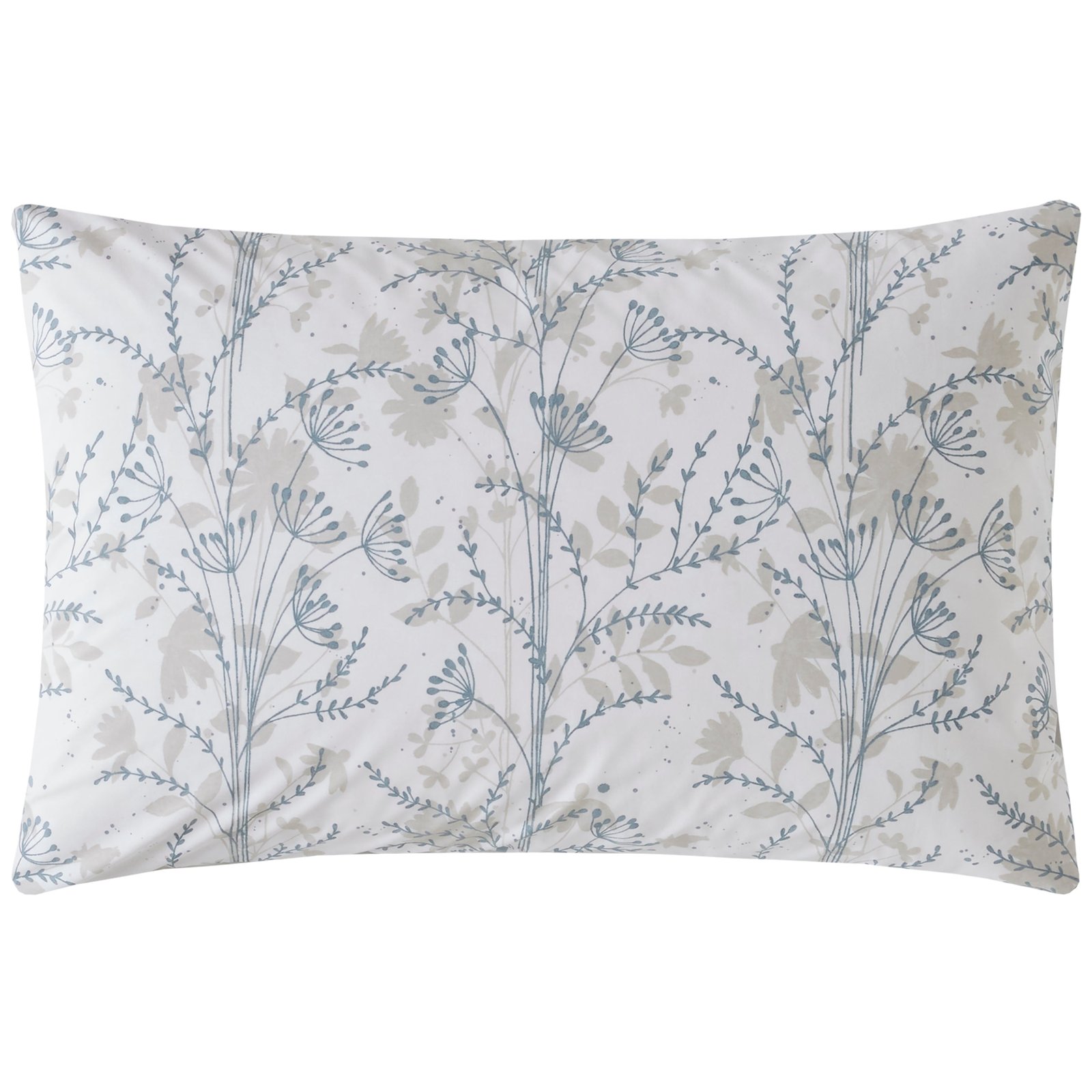 These 200-thread count cotton percale pillowcases feature hand-painted silhouettes of cow parsley and seed heads, inspired by a tranquil British country lane. Presented in soothing creams and chalk blue tones, they offer a refined natural aesthetic. The reverse side showcases a complementary painterly stripe, enhancing the overall relaxed and elegant design.