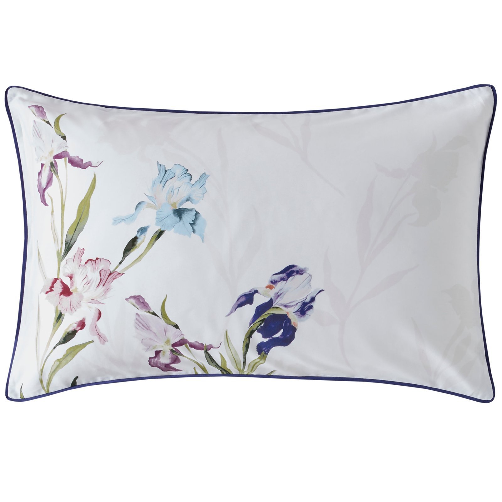 Adorned with trailing iris stems in vibrant jewel tones, these luxurious 220TC cotton sateen pillowcases feature a gentle floral silhouette on the reverse and are completed with a deep purple flat piped trim, creating a sophisticated floral accent.