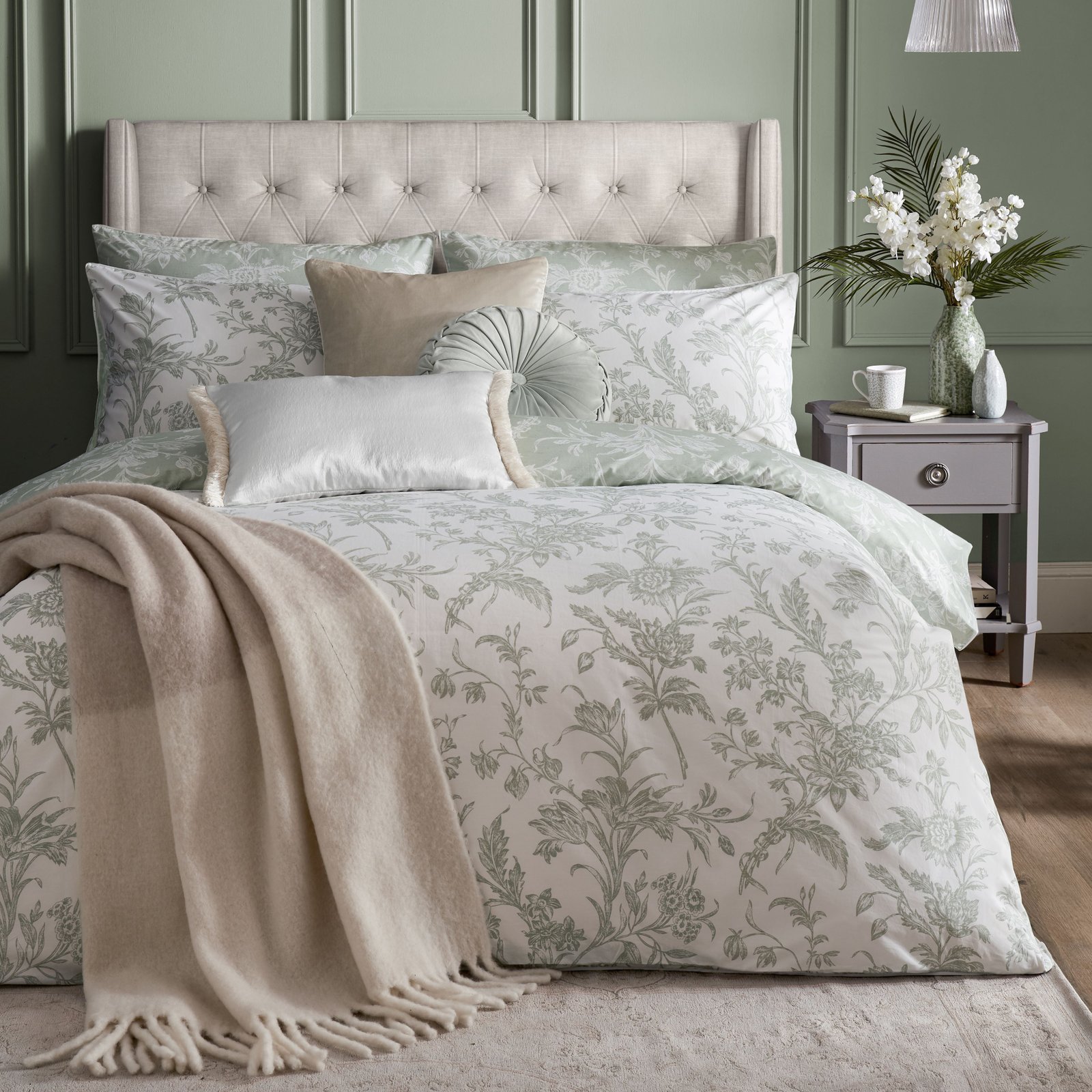 This Lloyd bedding set exudes timeless elegance with its printed floral pattern showcasing delicately curved stems of tulips, primulas, and potentillas. The finely detailed, hand-drawn design is printed on a 100% cotton percale fabric with a 200 thread count, featuring a soft, natural color scheme against a soothing Sage green background. It brings a fresh and tranquil ambiance to any bedroom, ideal for a refined and sophisticated look. Available in single, double, king, and super king sizes, each set includes a duvet cover and two pillowcases (one pillowcase with the single set). Pillowcases can also be purchased separately.