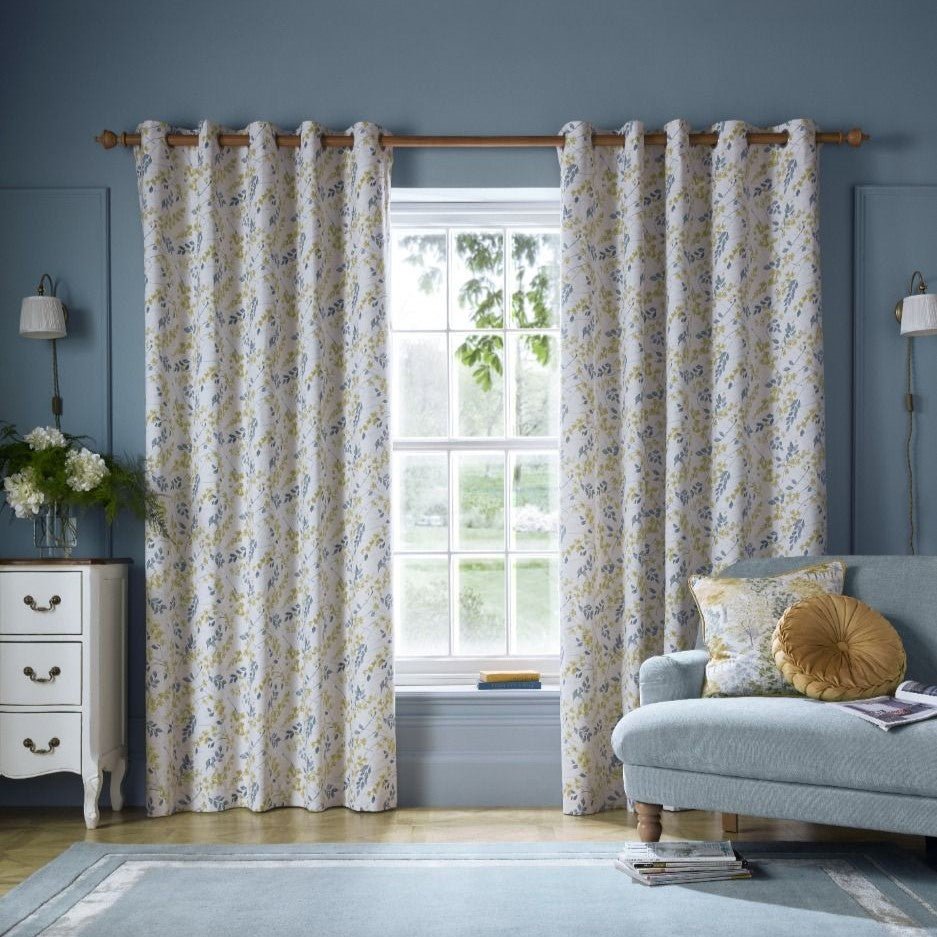 Upgrade your living area with the Laura Ashley Longston Sprig Ready Made Eyelet Curtains, made from 100% high-quality cotton. The design, inspired by an original paper artwork found in the Laura Ashley archives, showcases delicate watercolour flowers in shades of yellow and blue, intricately intertwined with trailing stems.