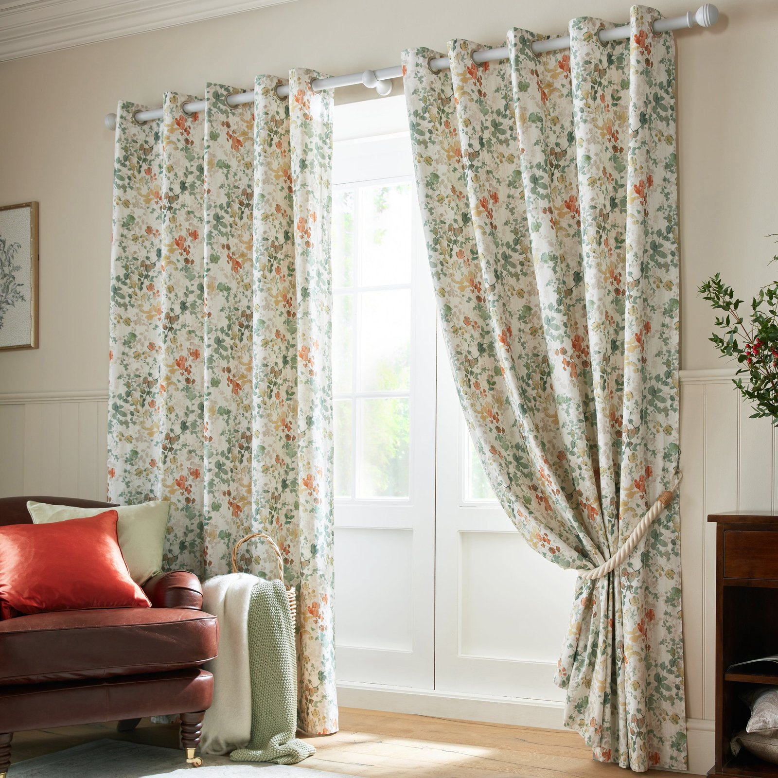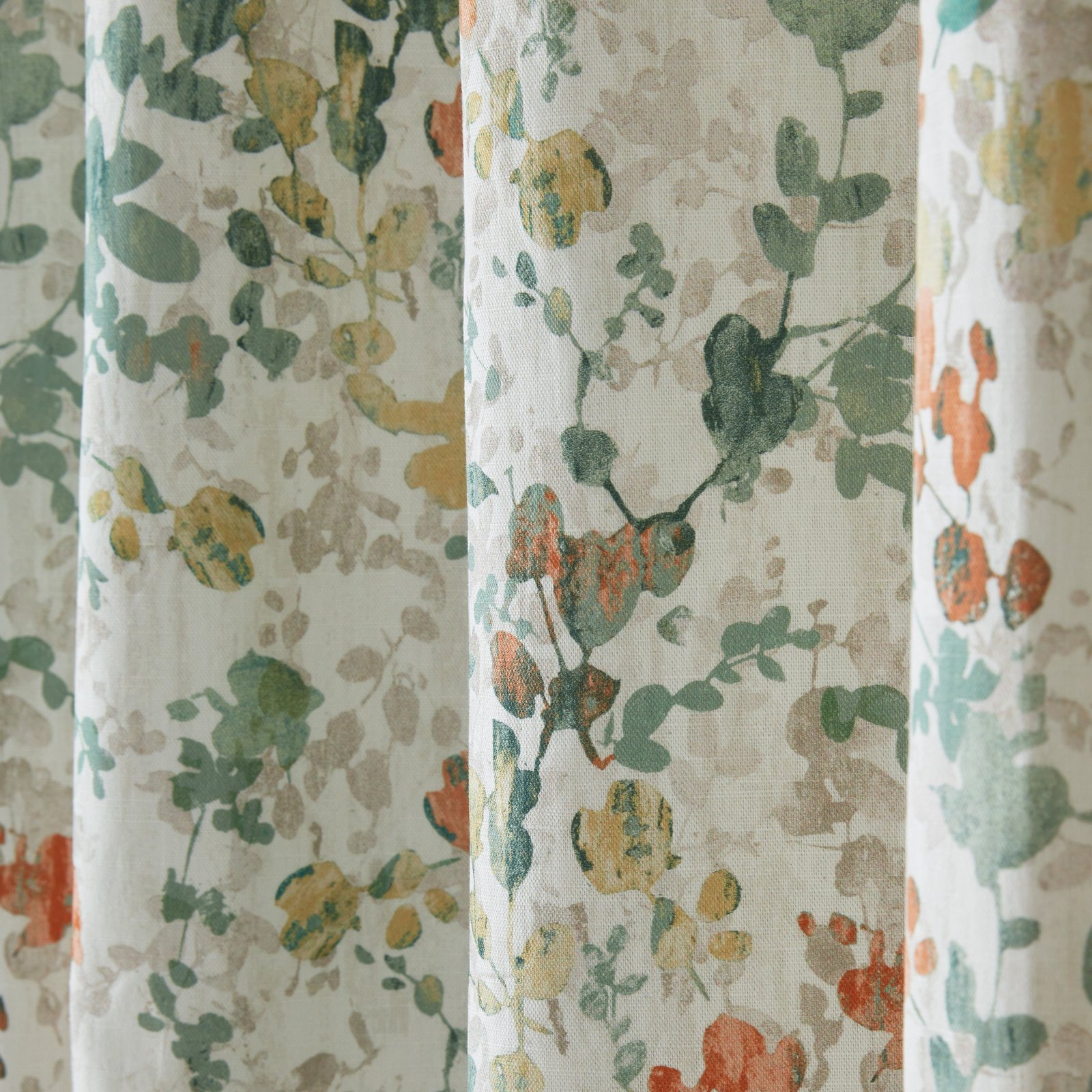 Transform your space with the Laura Ashley Old Castle Leaves Ready-Made Eyelet Curtains in Fern Green. The elegant design features a delicate trail of leaves in varying shades of green, terracotta, and sand, all printed on a soft, high-quality cotton linen. The eyelet header adds a touch of sophistication to these stunning curtains.