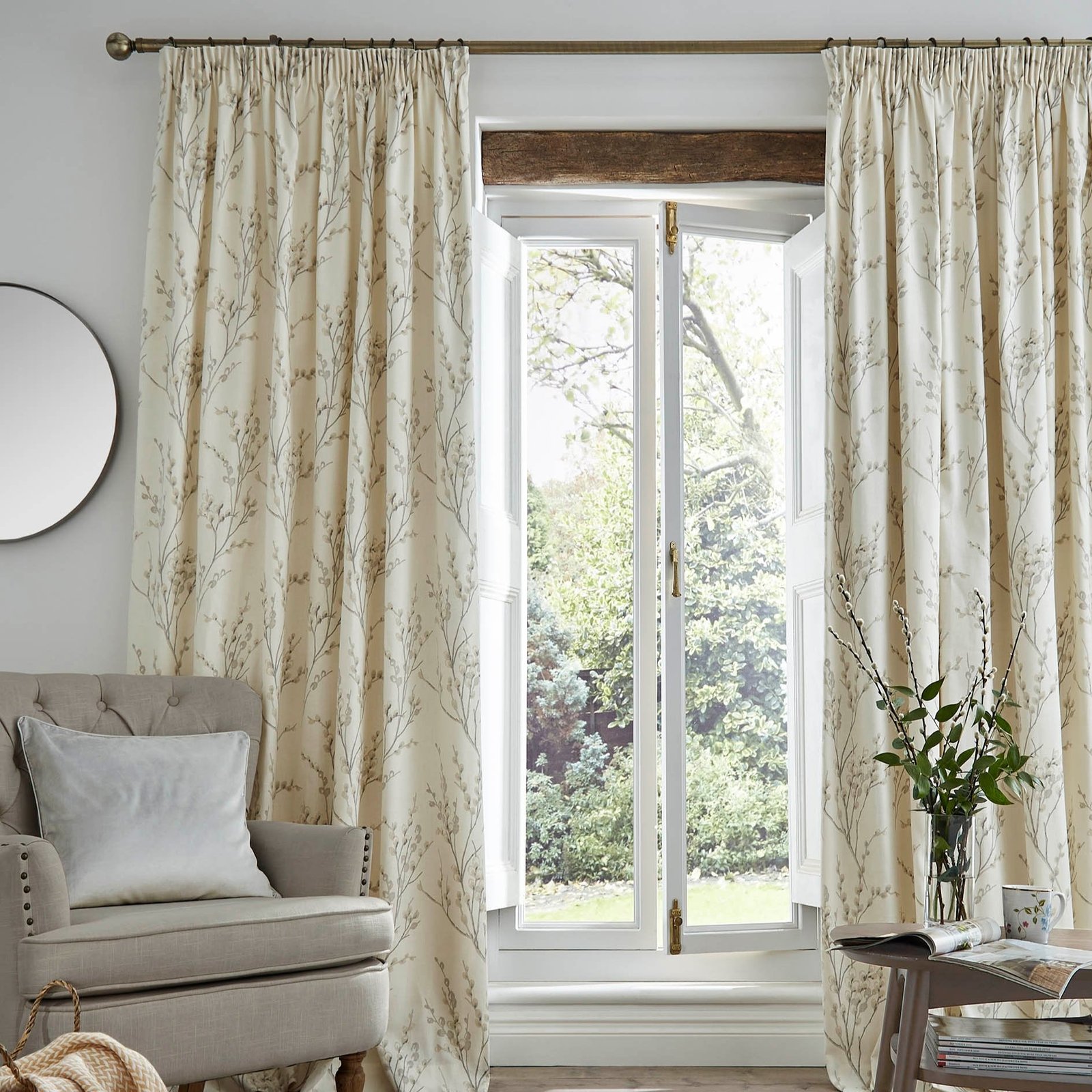 Expertly crafted with 100% cotton, the Laura Ashley Pussy Willow print features a timeless dove grey design against a backdrop of off-white. The delicate branching of budding pussy willows lends an inviting touch to these curtains, complete with a fully lined interior and pencil pleat header for instant enhancement. Pair with our separate matching tiebacks for a cohesive look.