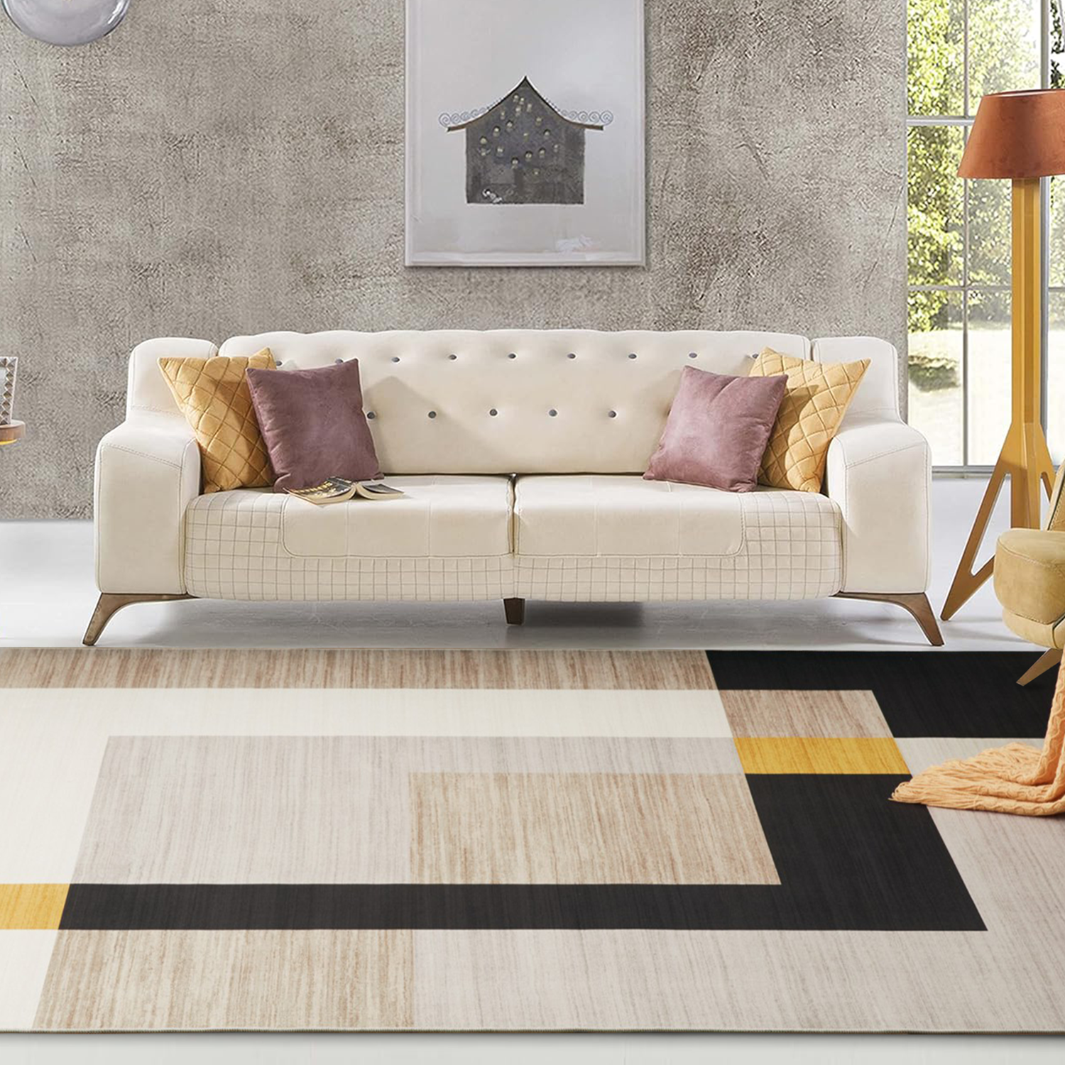 Introduce modern flair and cosy comfort to your home with the Imperial Room Minimalist Colour Block Rug. Made from soft, durable polyester, this striking colour block rug blends sophisticated grey, bold black, and warm mustard tones to create a stylish focal point. Its plush texture feels gentle underfoot, while the non-slip backing ensures it stays perfectly in place. Ideal for living rooms, bedrooms, or hallways, it balances contemporary design with practical everyday comfort.