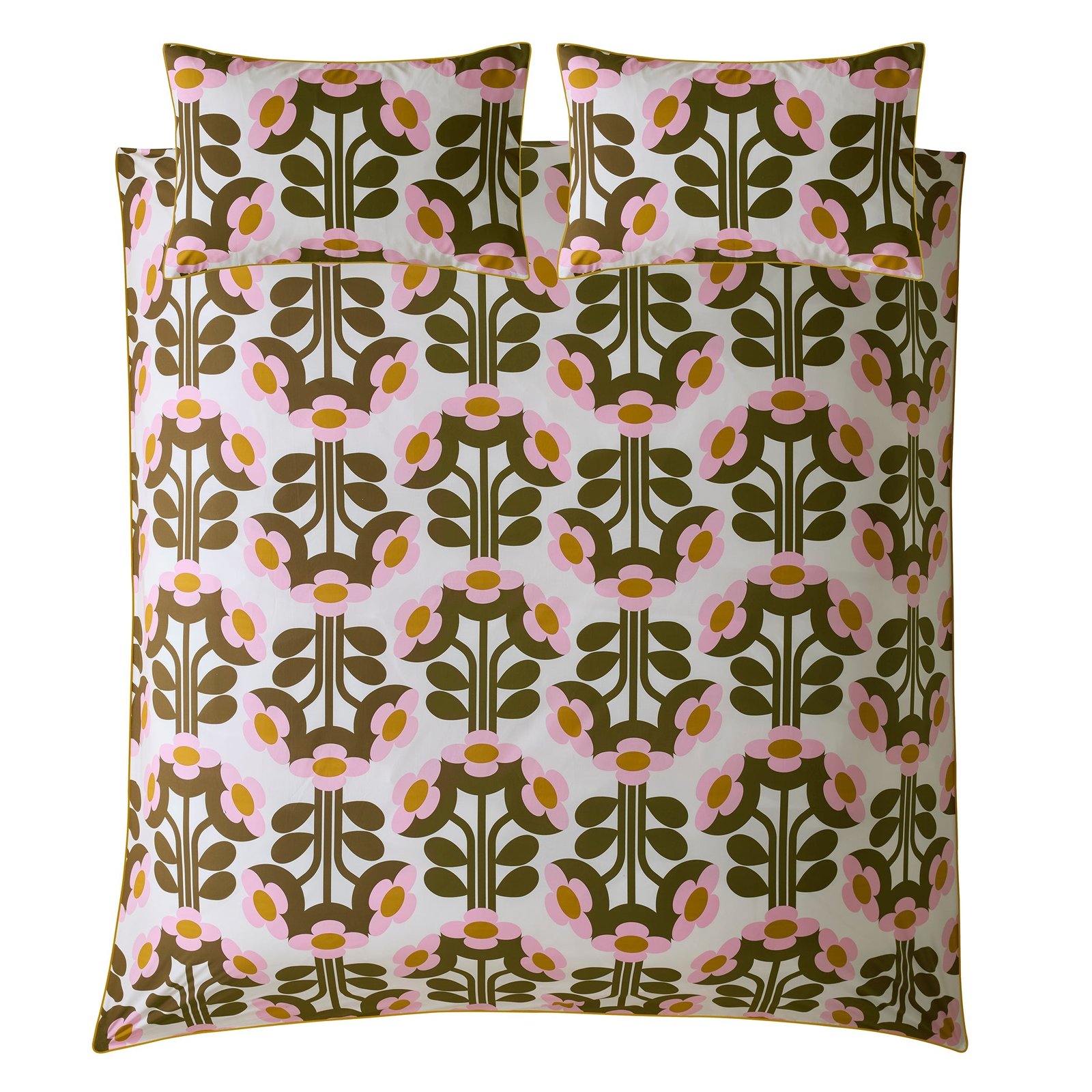 Experience a touch of the 1960s in your bedroom with this vibrant floral pattern from Orla Kiely. Featuring large Buttercup motifs in a retro colour palette of pink, olive green, and brown, this 100% cotton bedding set boasts a 200 thread count and a playful bright yellow flat piped edge detail on the pillowcases and duvet.Â