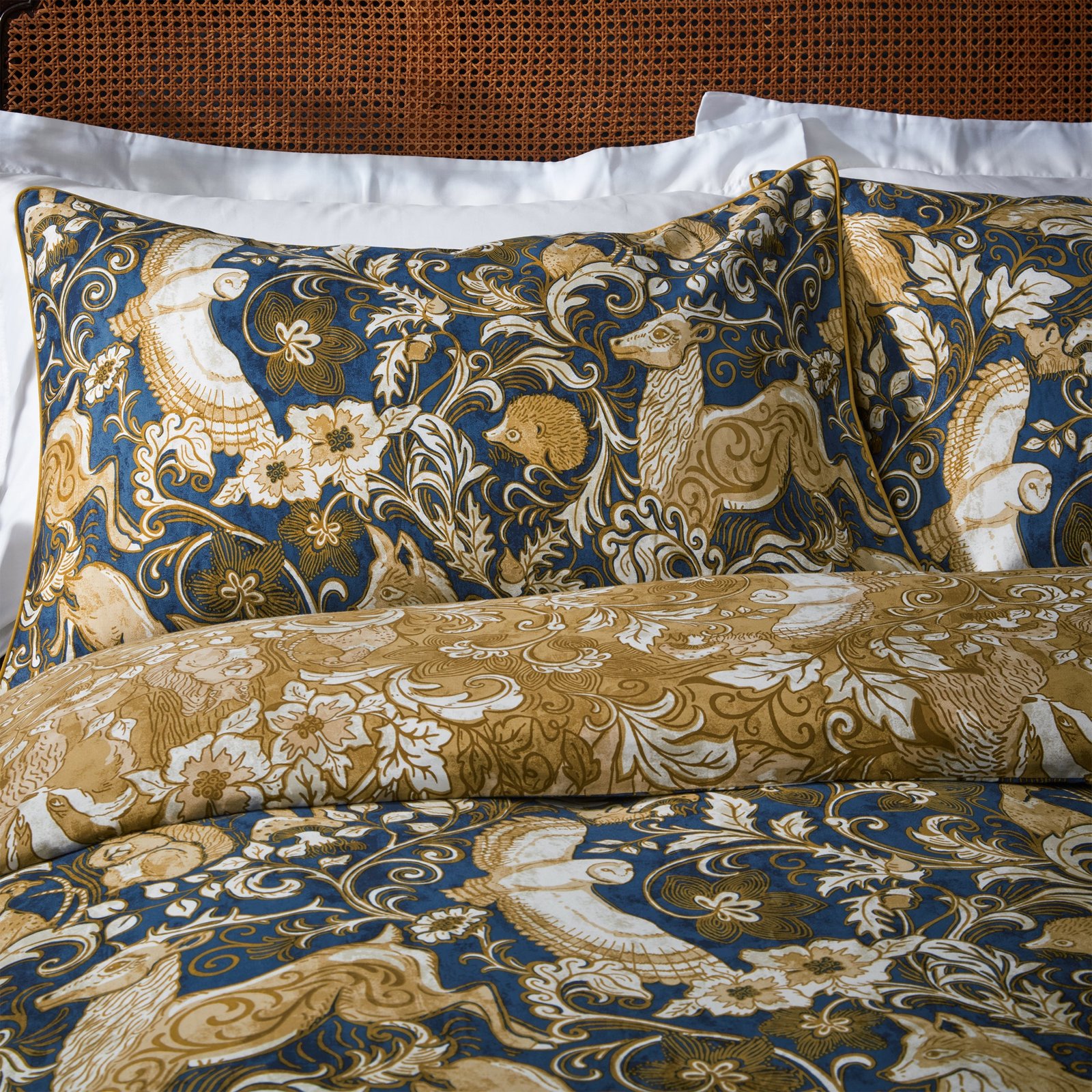 Bring the mood of winter into your house with this dramatic tableau of posed Foxes and bounding Hares among flowers and foliage. This 200 thread count duvet cover set will give your bedroom an opulent finishing touch. Match the Harewood cushion, which has a contrasting soft velvet plain reverse and piped edge, to finish the look.