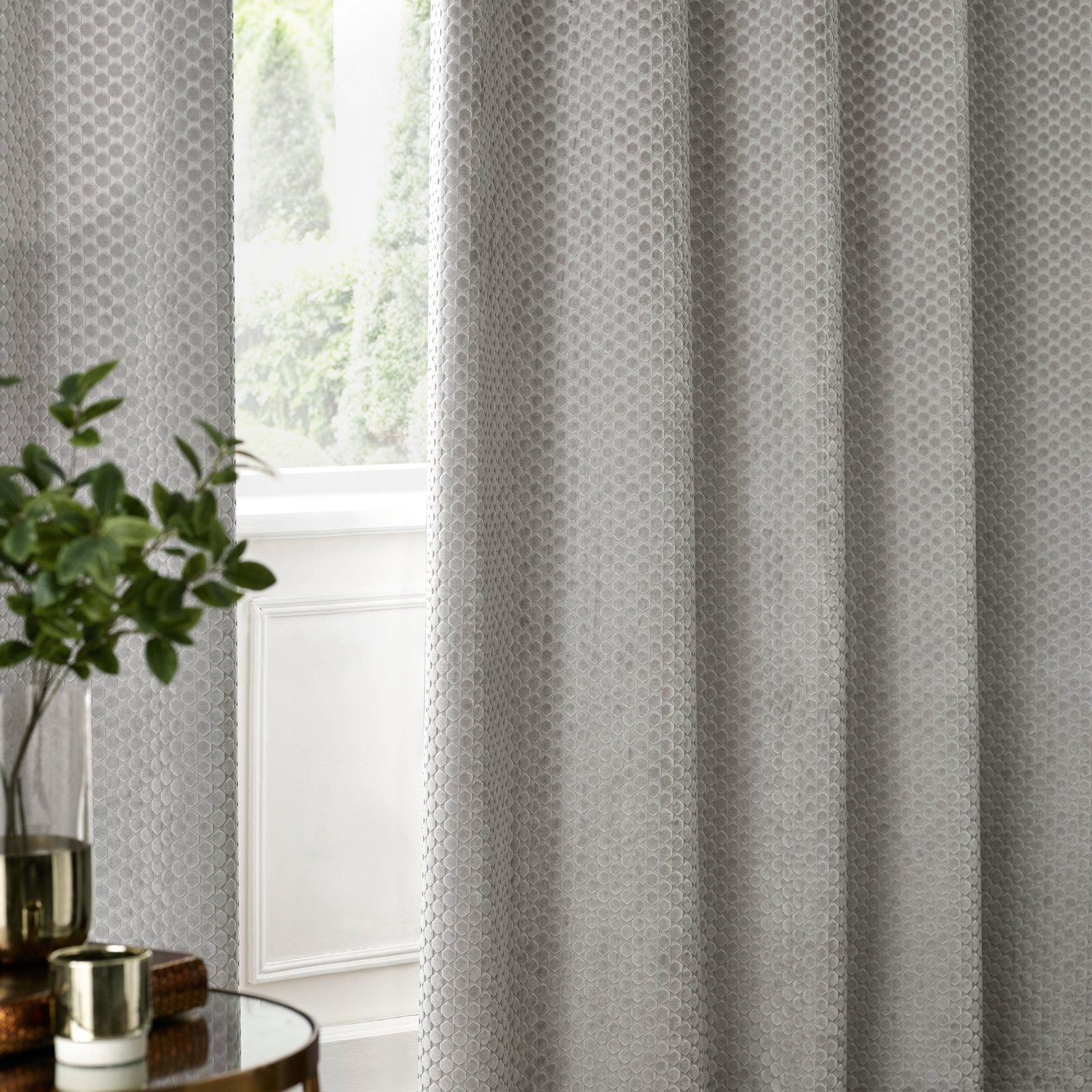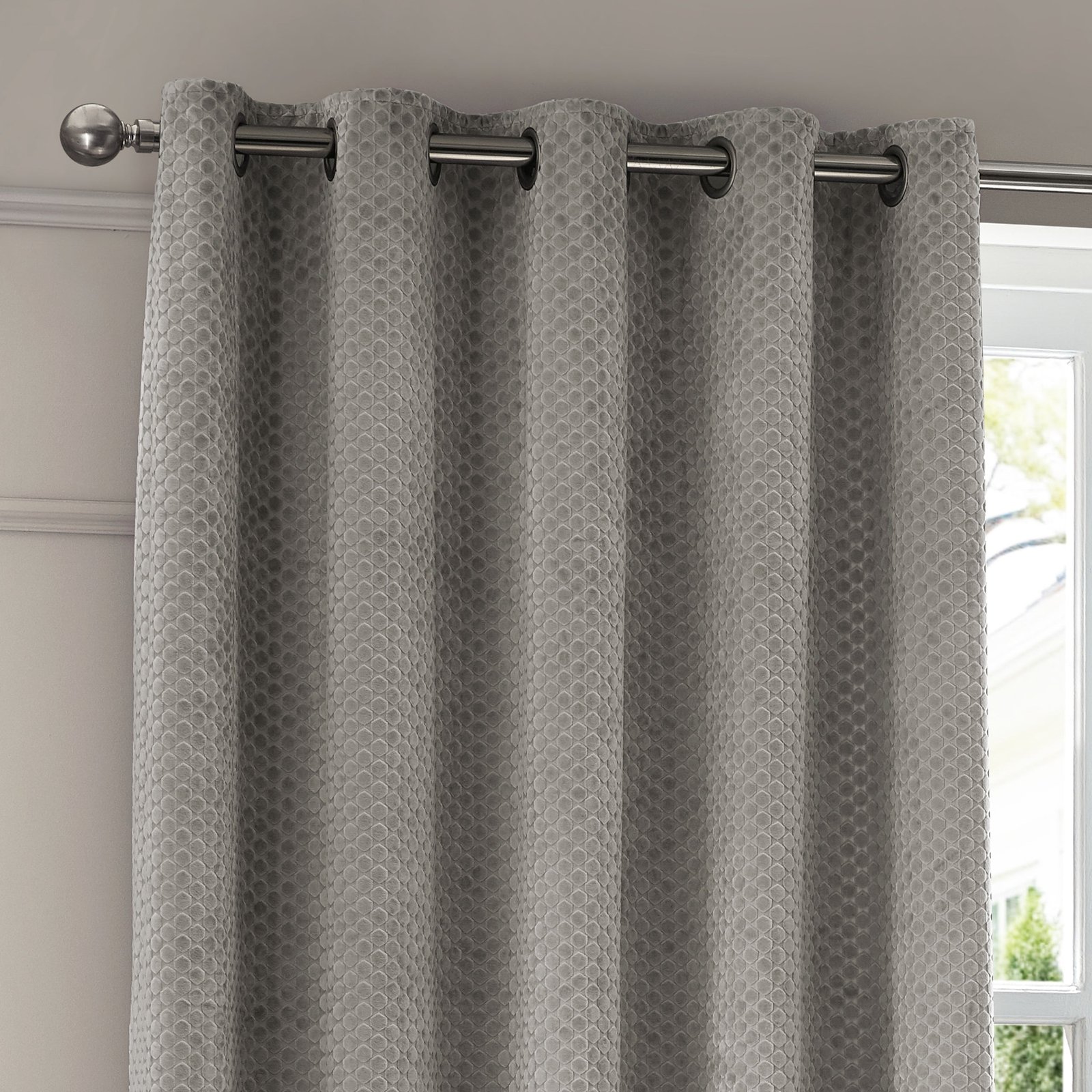 Experience refined elegance with these Neptune Velvet Eyelet Curtains in silver. Crafted from luxurious cut velvet featuring a striking geometric pattern, they seamlessly blend contemporary design with timeless sophistication. The fully lined construction delivers a pristine drape whilst effectively blocking light and maintaining privacy. Ideal for those seeking to infuse their interiors with understated glamour, these durable curtains combine aesthetic appeal with practical functionality, transforming any room into a sanctuary of style and comfort.