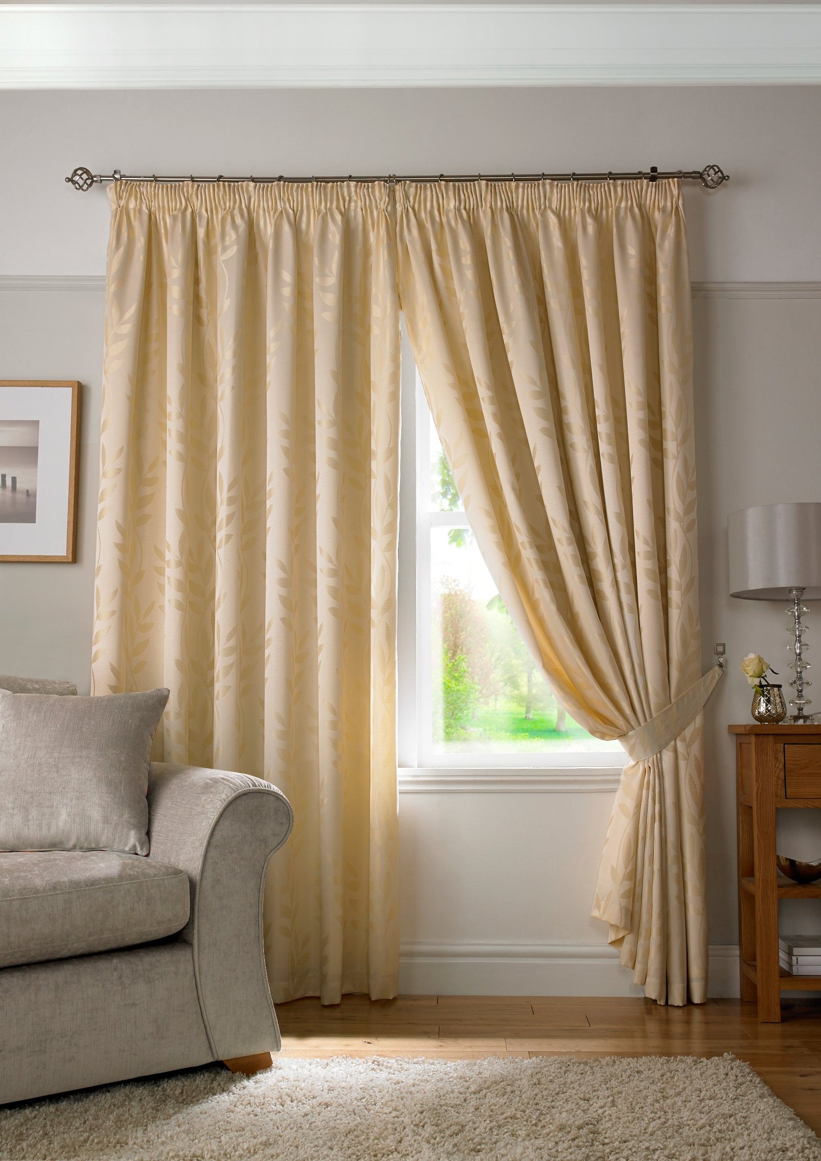 The Tivoli ready made curtains design has an intricately woven jacquard leaf pattern which incorporates a slub textured yarn. The Tivoli fully lined curtains come with a traditional heading tape suitable for a curtain track or pole. This soft cream shade will blend easily with most colour schemes. This pair of curtains has tiebacks included.
