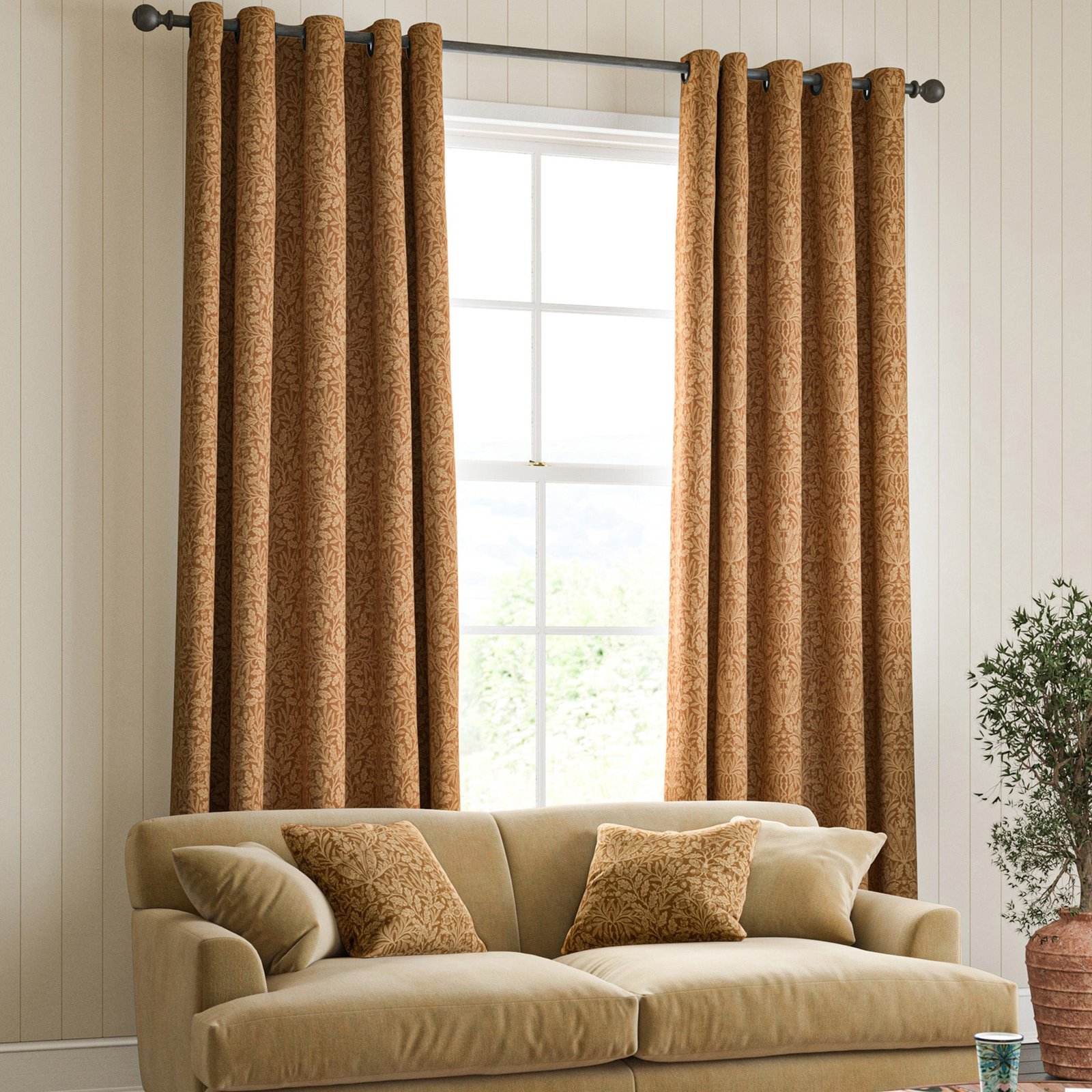 Crafted from 100% cotton, these Acorn made-to-measure curtains in the rich Russet shade bring the timeless elegance of the William Morris collection into your home. Designed to fit your windows perfectly, they combine classic design with practical functionality. The natural cotton fabric offers durability and a soft texture, enhancing any room with warmth and style. Ideal for those seeking bespoke window treatments that reflect expert craftsmanship and heritage-inspired aesthetics.
