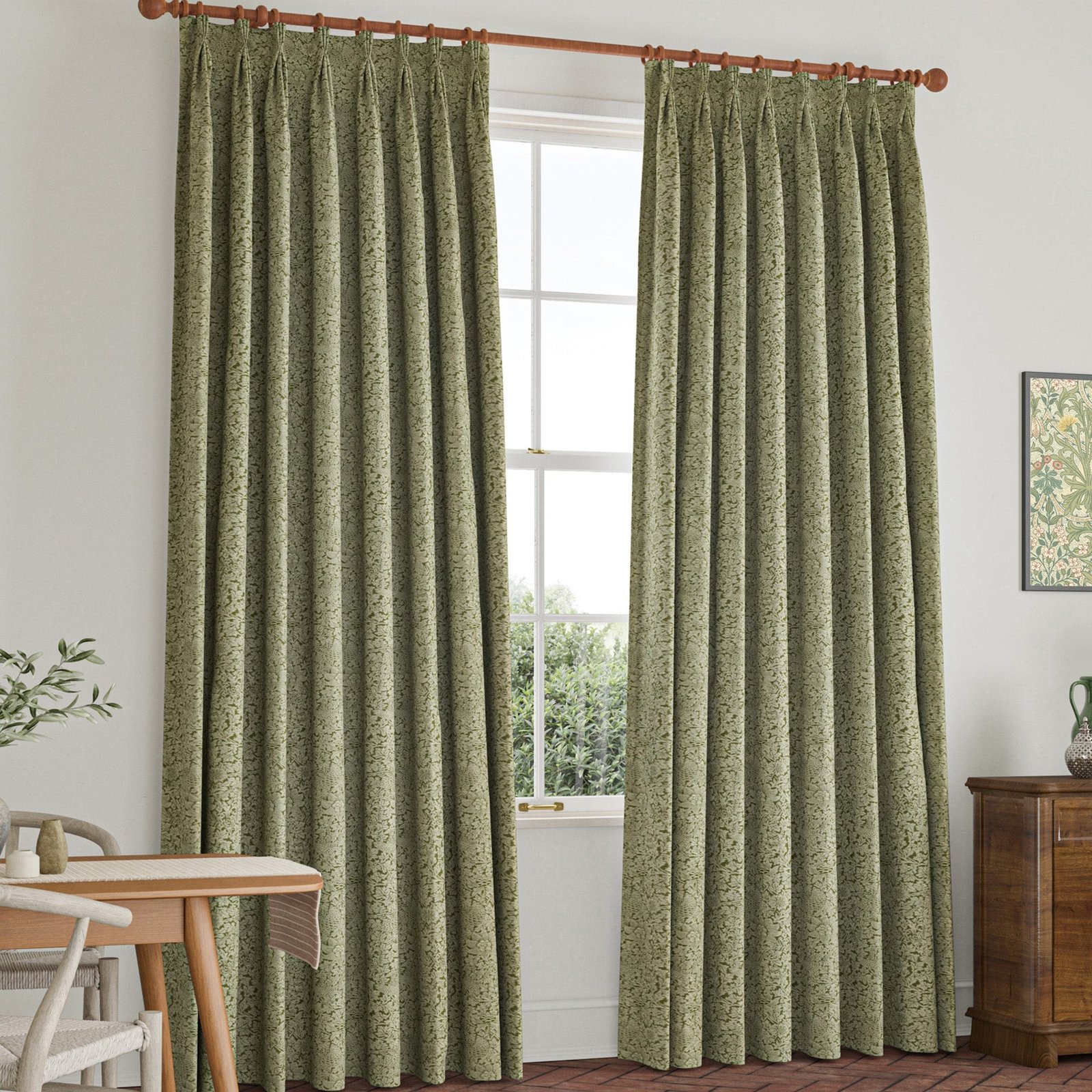 These made-to-measure curtains feature the iconic Bird and Anemone design from the William Morris collection, presented in a rich Moss shade. Crafted from a high-quality blend of 42% polyester, 42% viscose, and 16% cotton, the fabric offers durability, a soft texture, and excellent drape. Ideal for adding a touch of classic elegance to any room, these curtains combine timeless artistry with practical performance, ensuring both aesthetic appeal and long-lasting use. Perfect for those seeking bespoke window treatments that reflect refined taste and craftsmanship.