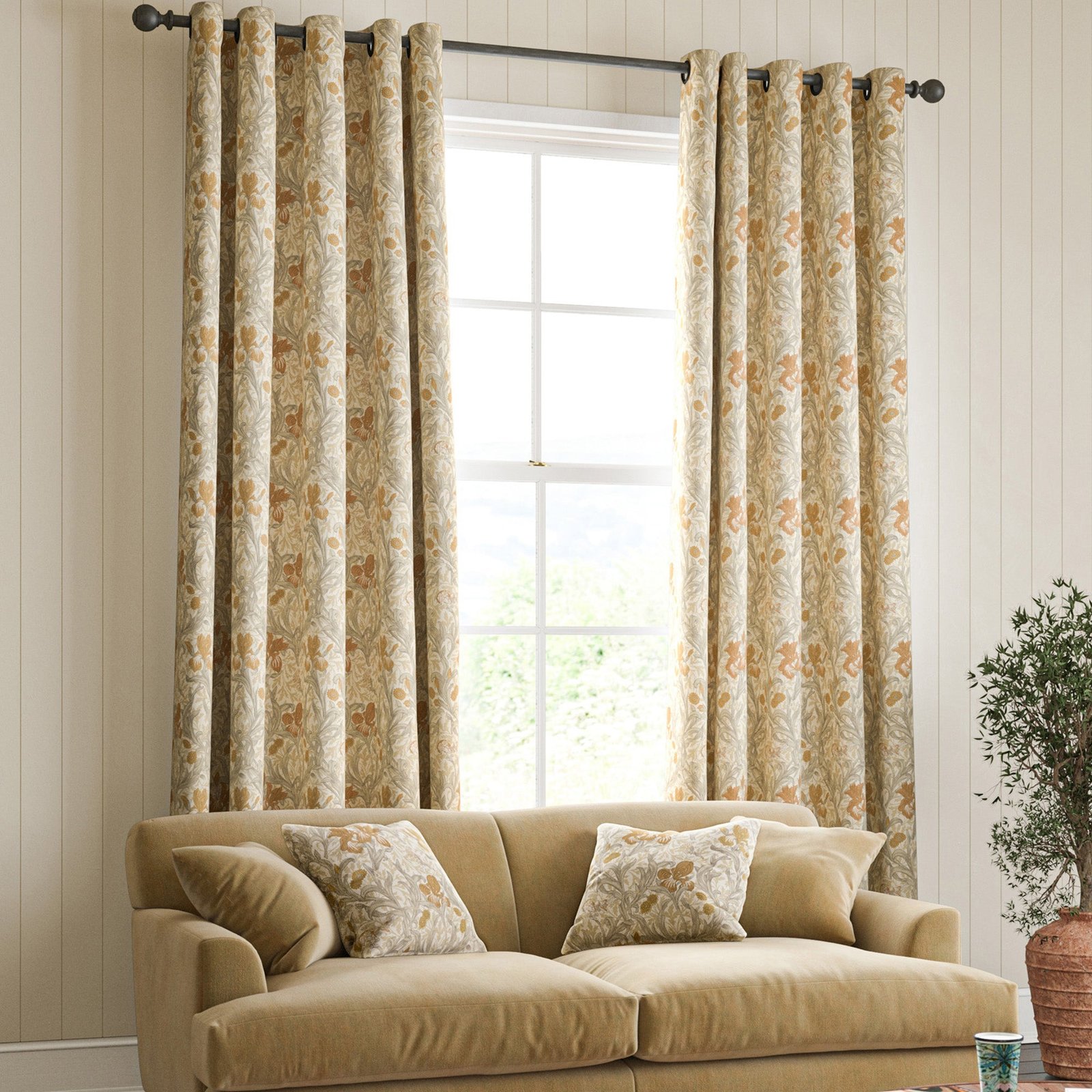 These William Morris Iris made to measure curtains in the shade Honey are crafted from 100% cotton, offering a natural, breathable fabric that enhances any room with timeless elegance. Part of the renowned William Morris collection, the design features intricate floral patterns that bring classic charm and sophistication to your interiors. Custom made to your exact measurements, these curtains ensure a perfect fit, combining aesthetic appeal with practical functionality. Ideal for adding warmth and style, they provide a durable and easy-care window dressing solution that complements both traditional and contemporary decor.