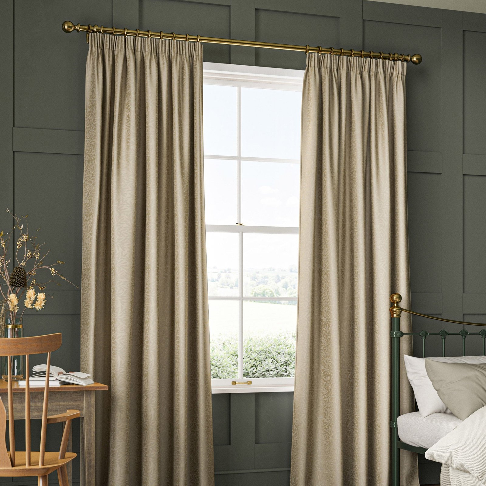 Willow was designed by William Morris in 1874 and was produced as a hand-block-printed wallpaper. This stunning satin jacquard depicts intwined willow leaves in a flowing upward movement. The opulent satin weave in the ground contrasts against the shimmering textured weave within the leaves. The curated mix of textures and soft sheen brings added elegance to this iconic William Morris design. Willow is also available as a single colour print on cotton.