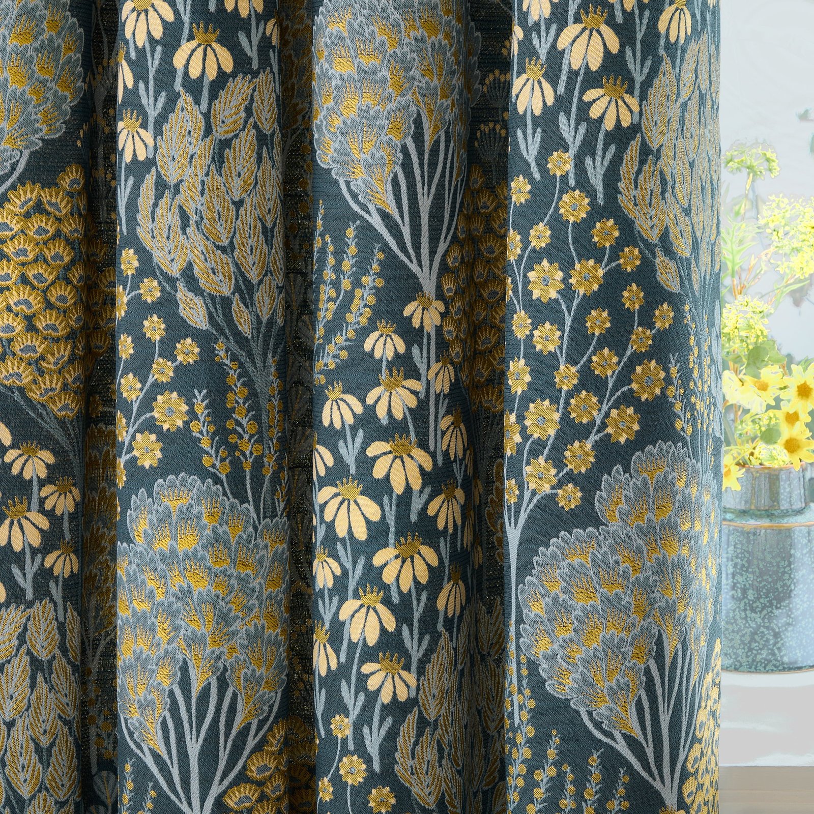 Wylder Nature Ophelia Floral Jacquard Ready Made Eyelet Blockout Curtains Blue Saffron