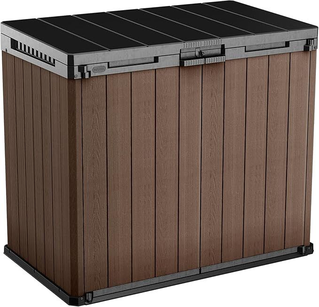 Keep your garden tidy with the Keter 1150L Outdoor Storage Shed, featuring a stylish brown wood-effect design crafted from durable Evotech composite materials. Measuring 141 x 82 x 120 cm, this spacious unit offers ample room for garden tools, BBQ equipment, and two 240L wheelie bins. Its weather-resistant construction, heavy-duty floor, and built-in ventilation ensure long-lasting outdoor use without rust, rot, or fading. The hydraulic lid and double doors provide easy access, while the lockable design keeps your items secure. Additional smart features include a bin lid-opening kit and shelf brackets for customizable storage solutions. Ideal for versatile, secure, and stylish garden organization.